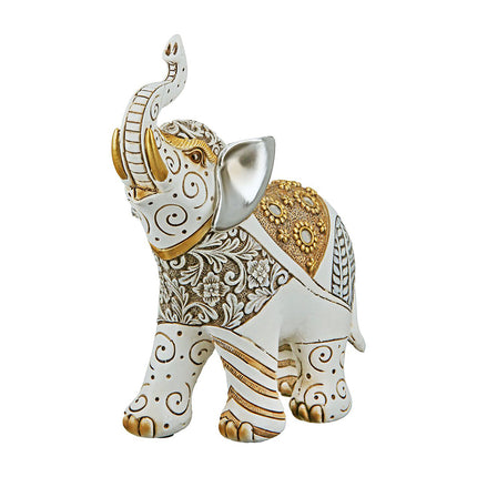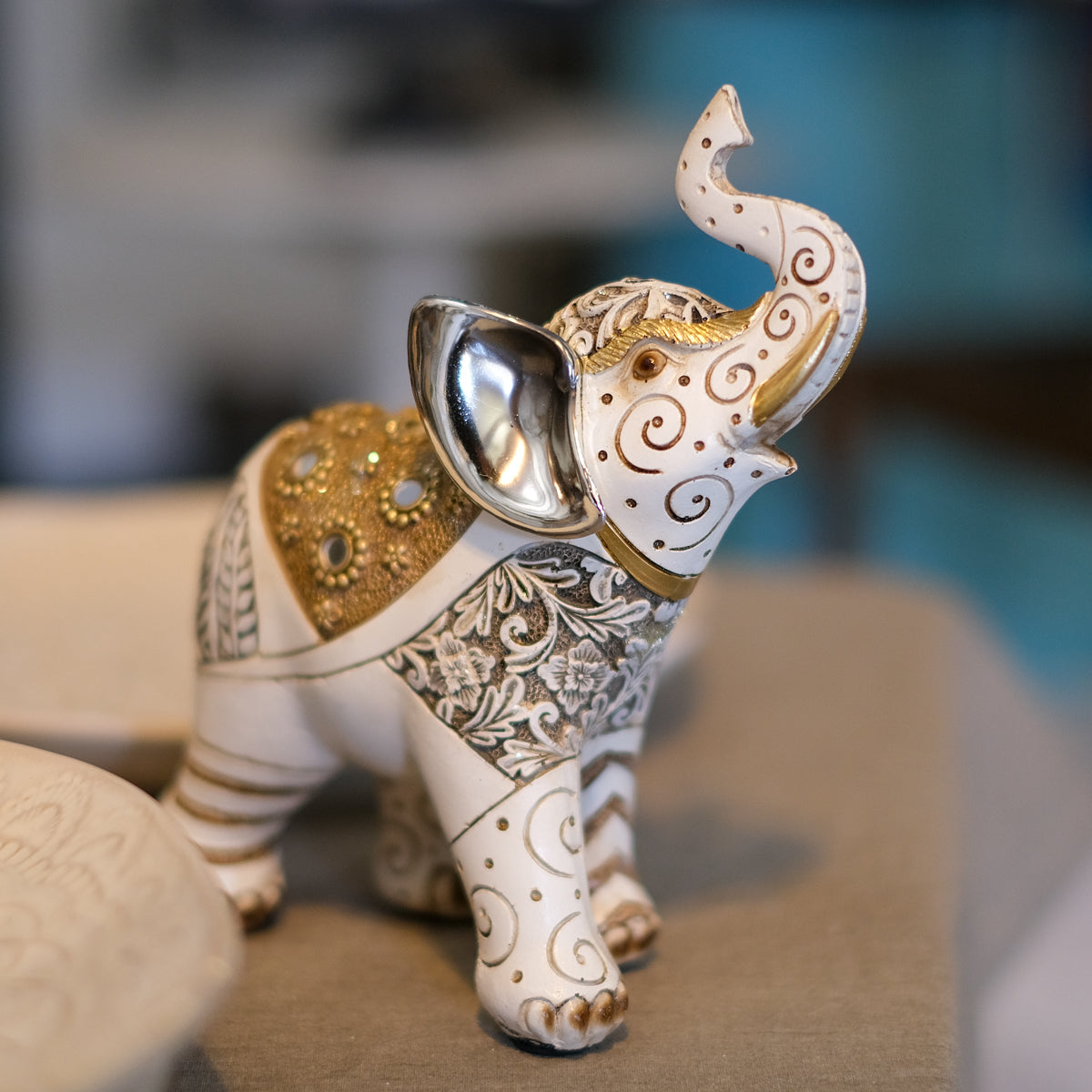 En vackert dekorerad elefant med lyxig känsla och detaljrikedom i både form och mönster. Den upphöjda snabeln sägs bringa lycka, och här kombineras den klassiska elefantsymboliken med ett modernt, sofistikerat uttryck i guld, silver och reliefmönstrat blommotiv.