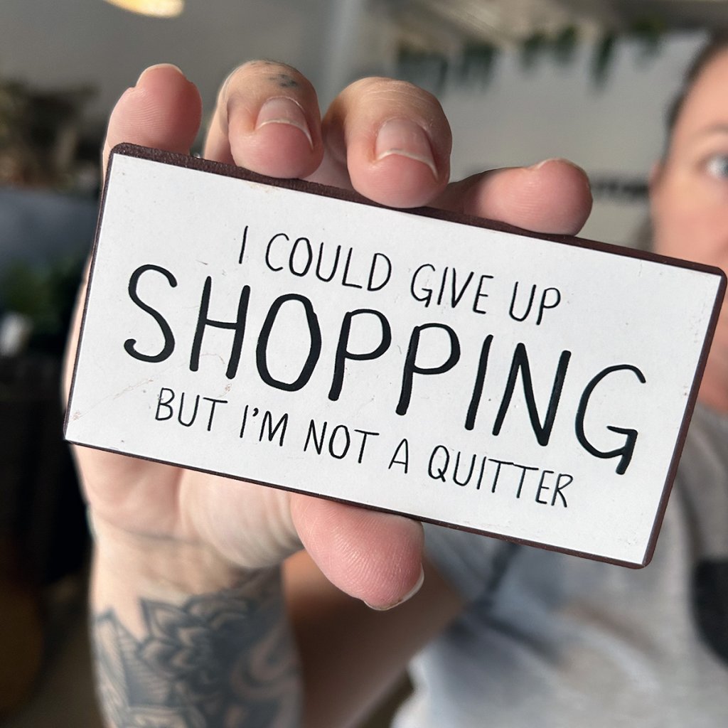 Charmig magnet med texten: "I could give up shopping, but I'm not a quitter".