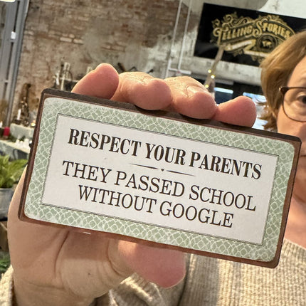 Charmig magnet med texten: "Respect your parents - they passed school without Google"