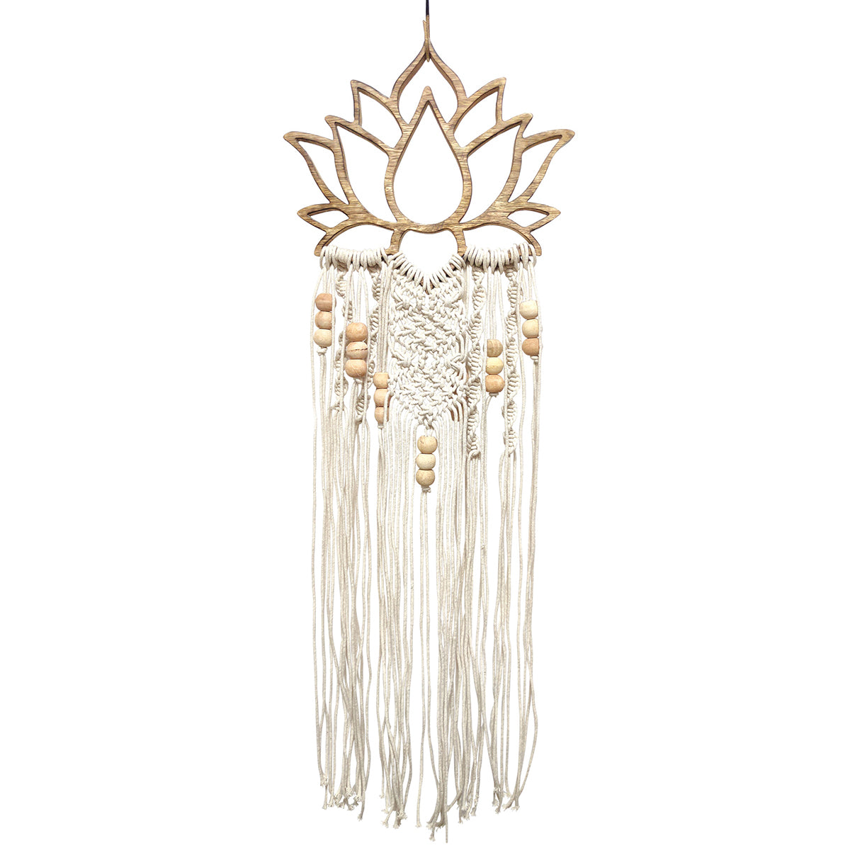 Väggdekoration i makramé med en lotusformad överdel i trä och långa, handknutna trådar i ljus textil. Trädetaljen ger stadga medan de mjuka fransarna bidrar till ett boho-inspirerat och avslappnat uttryck. Passar fint som väggdekoration i sovrum, vardagsrum eller hall.