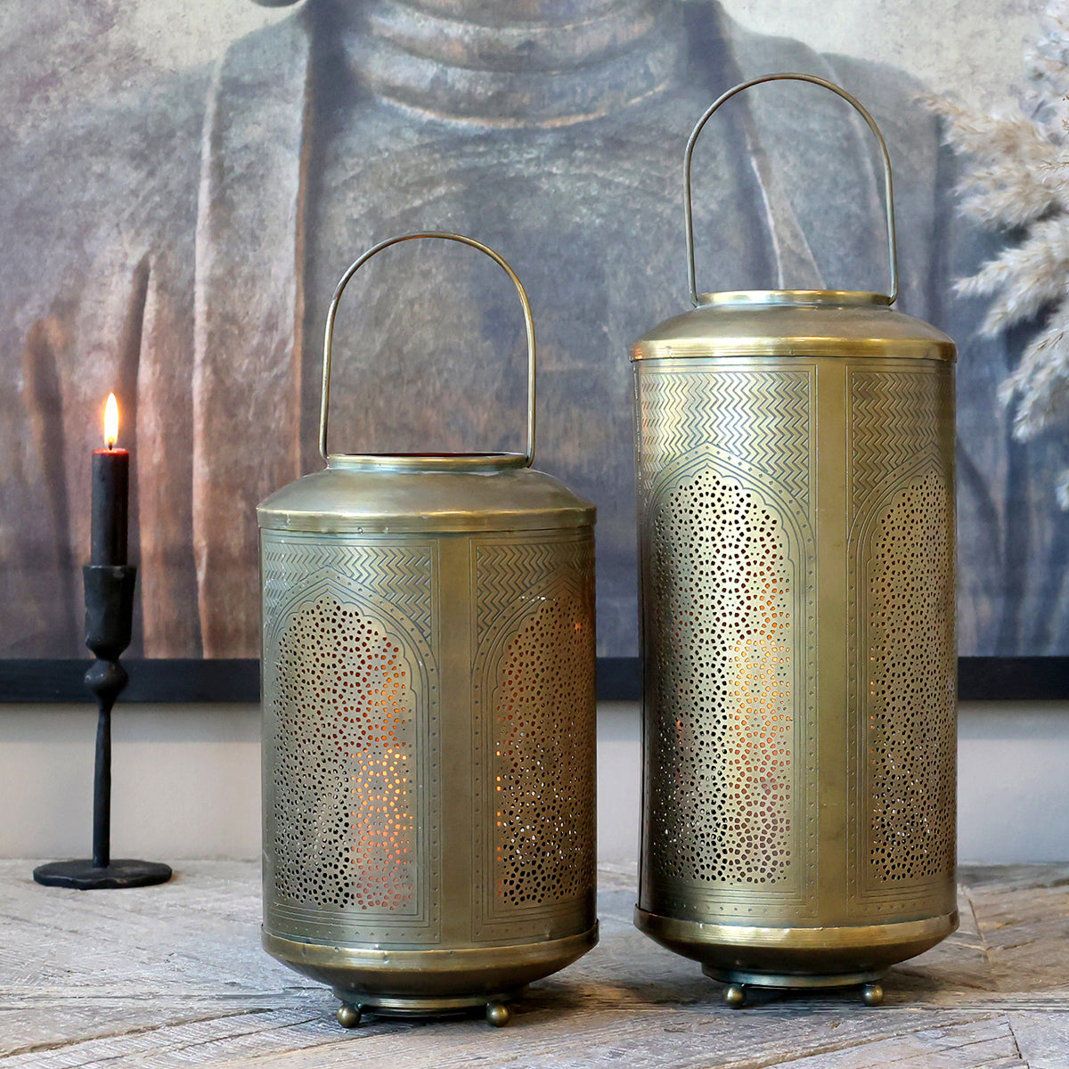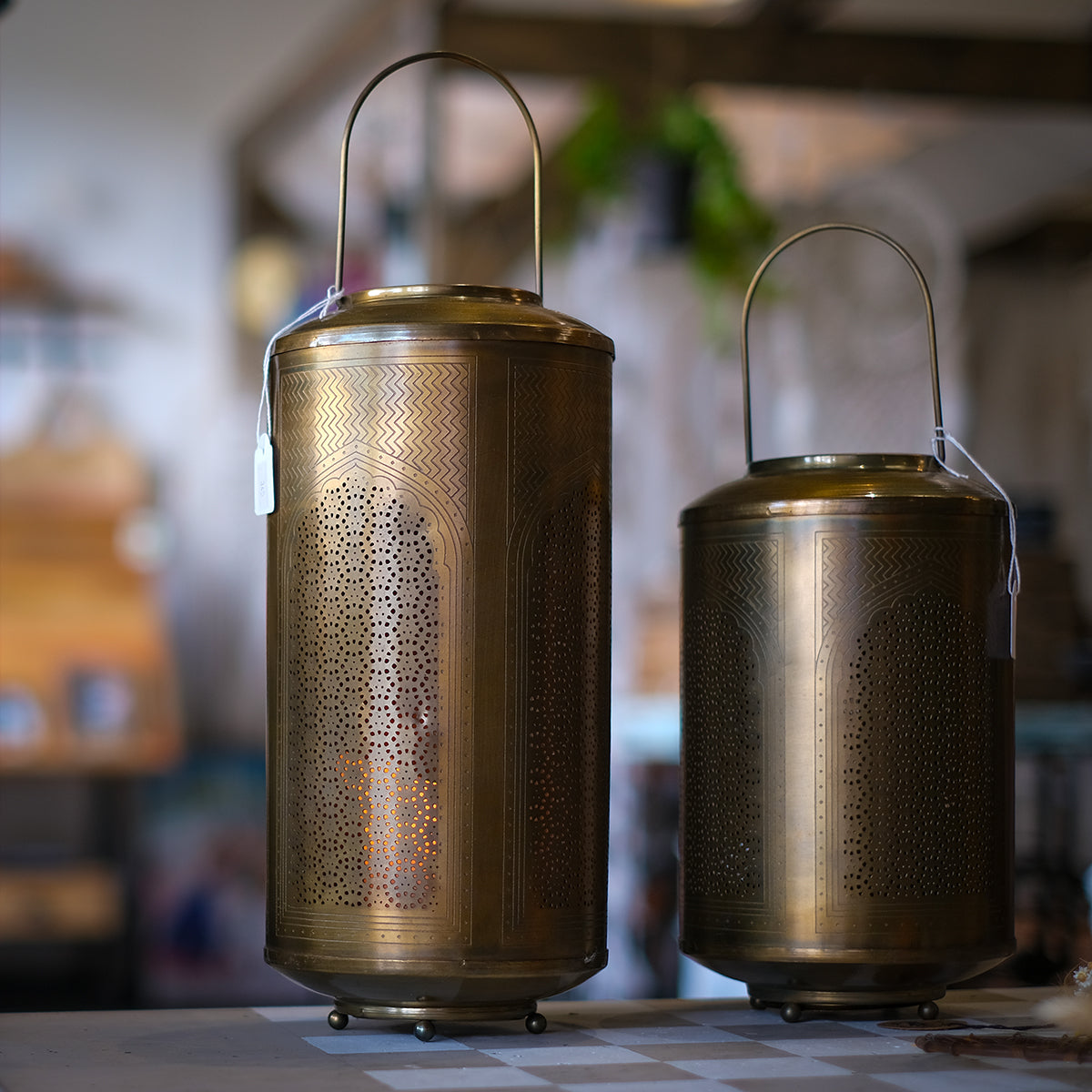 Dessa stämningsfulla lyktor i antik mässing sprider ett mjukt och varmt sken genom sina vackert stansade mönster. Perfekta för dig som vill skapa en ombonad känsla med en känsla av mystik.