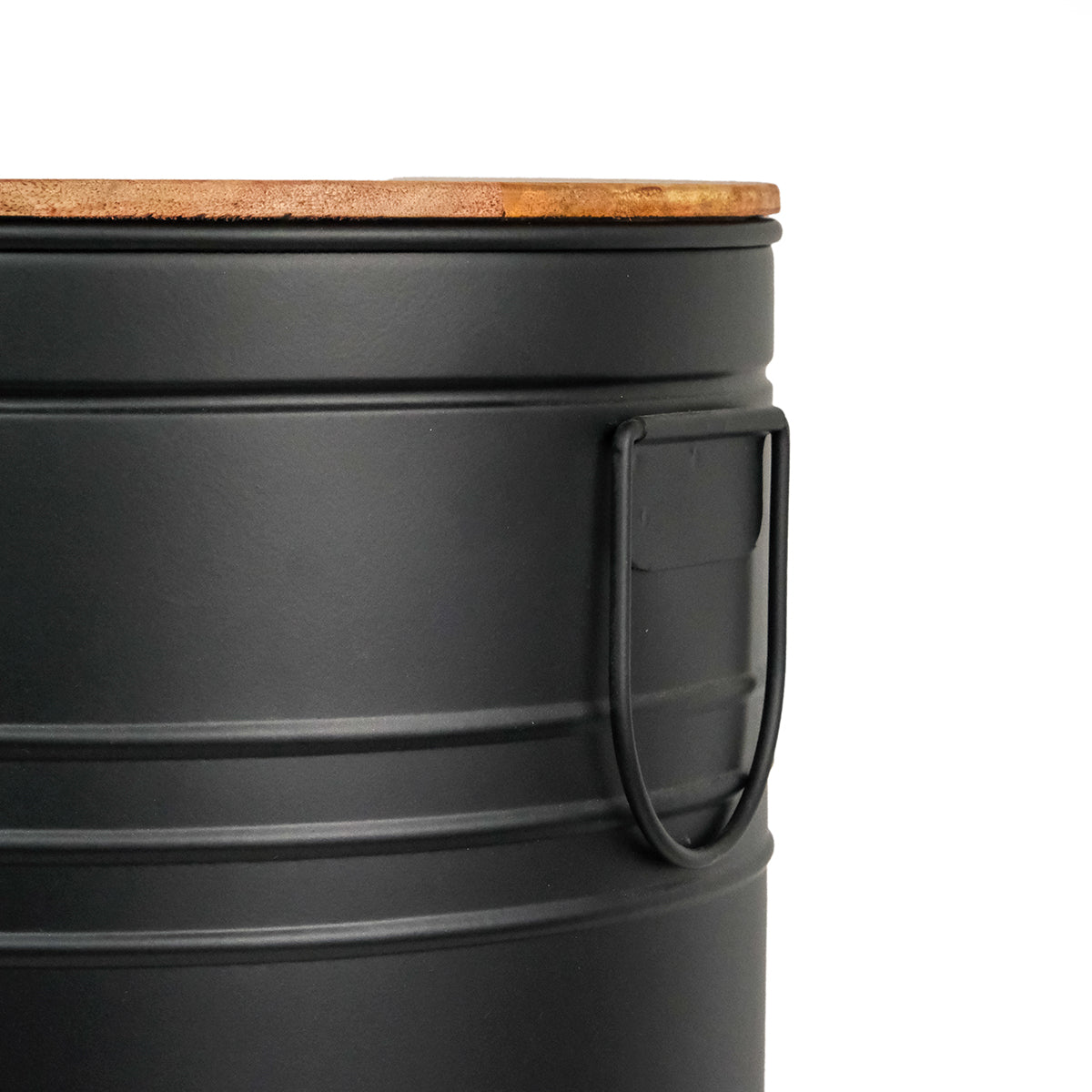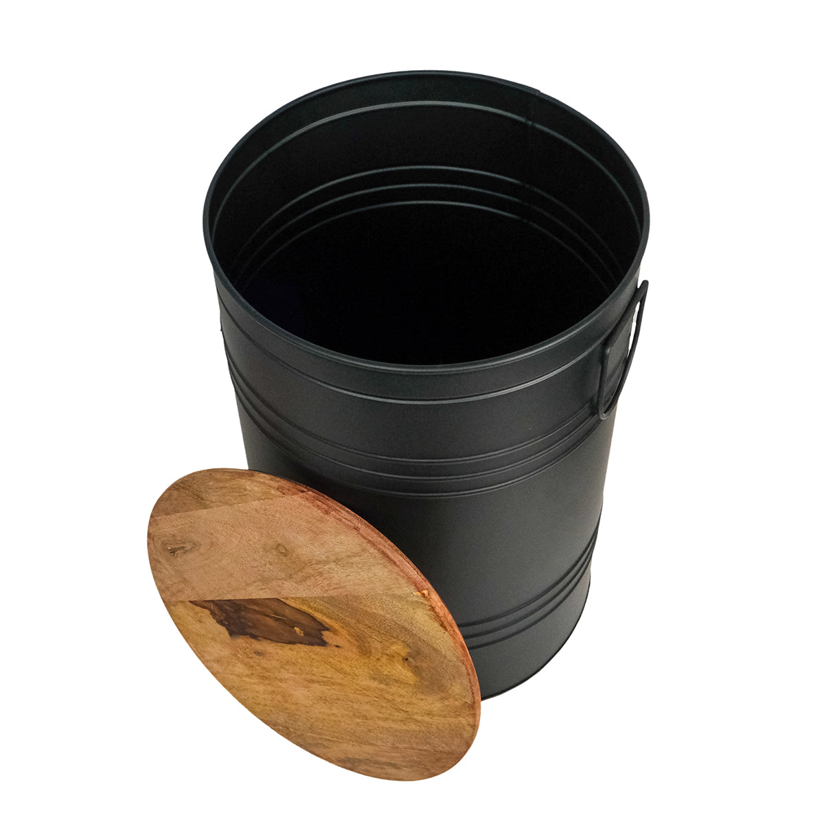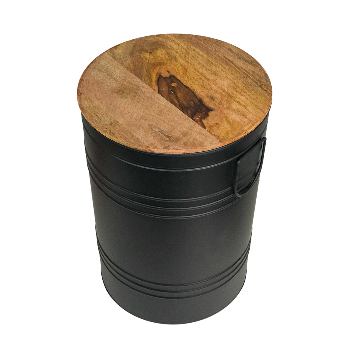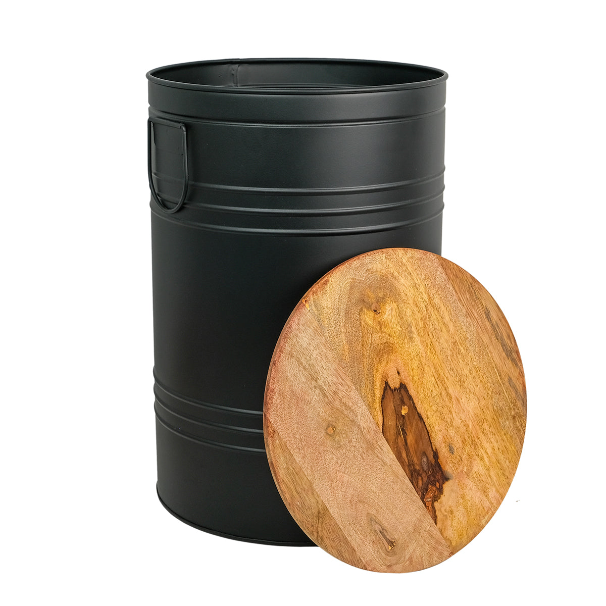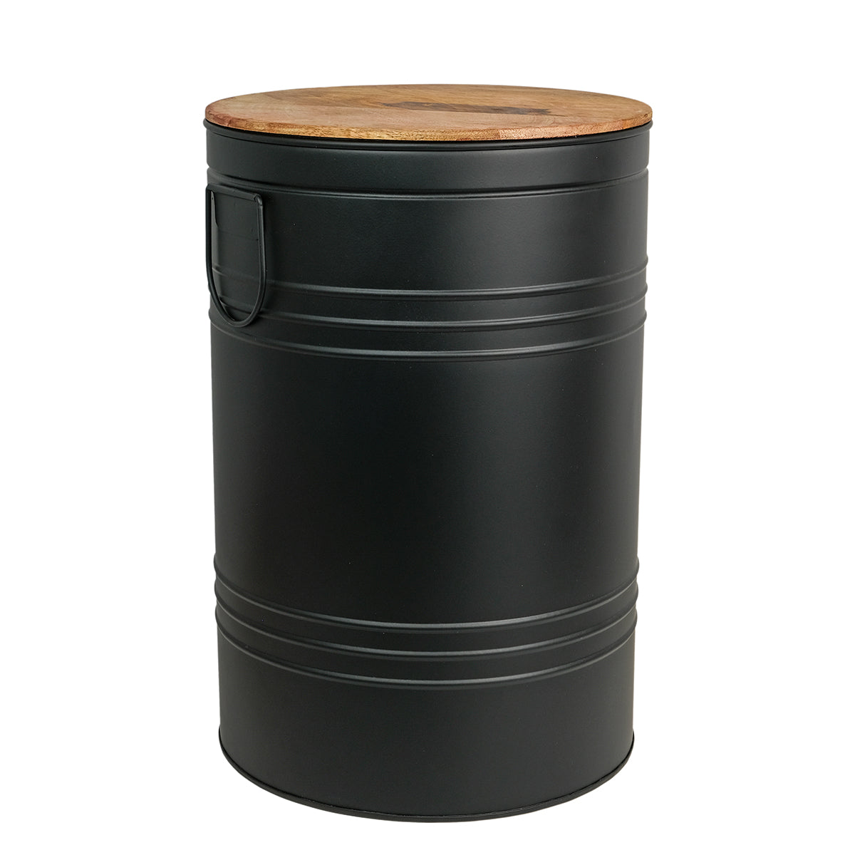 En svart tunna, med fina detaljer och två bäröglor samt en avtagbar träsits av vackert mangoträ. Rymmer oväntat mycket förvaring.