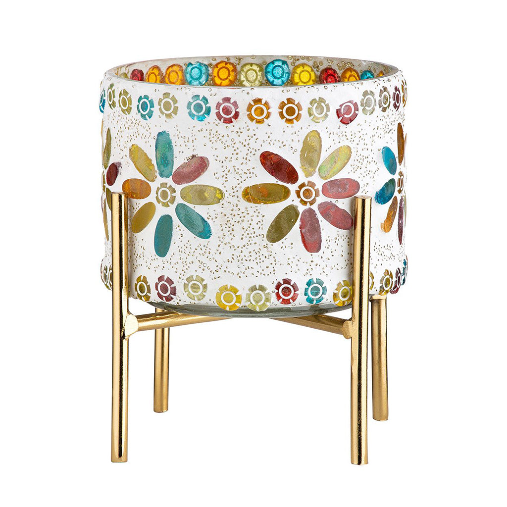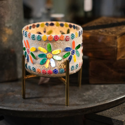 Lys upp ditt hem med denna charmiga mosaiklykta på ett mässingsfärgat stativ! De vackra färgade mosaikdetaljerna skapar ett stämningsfullt och varmt ljussken, perfekt för mysiga kvällar. Lyktans unika design med blommotiv och gnistrande färger gör den till en dekorativ detalj även när den inte är tänd. Eftersom lyktorna är handgjorda kan små variationer i färg och mönster förekomma, vilket gör varje exemplar unikt.