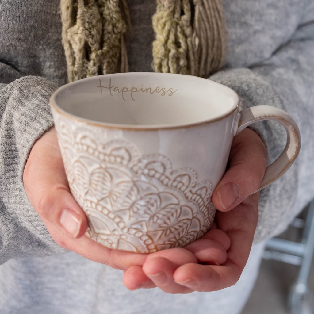 Otroligt mysig keramikmugg med mandala-inspirerat mönster.