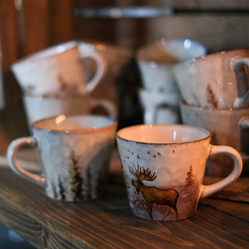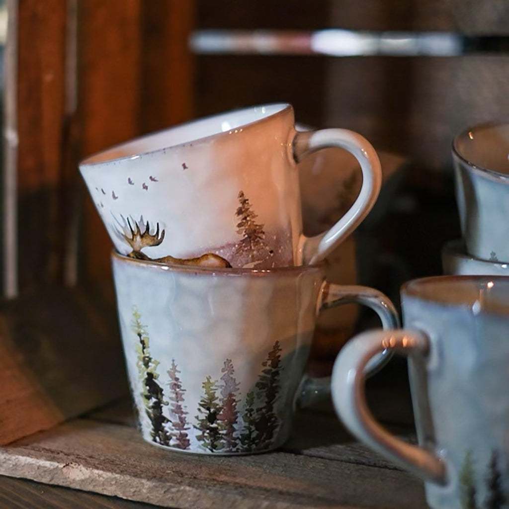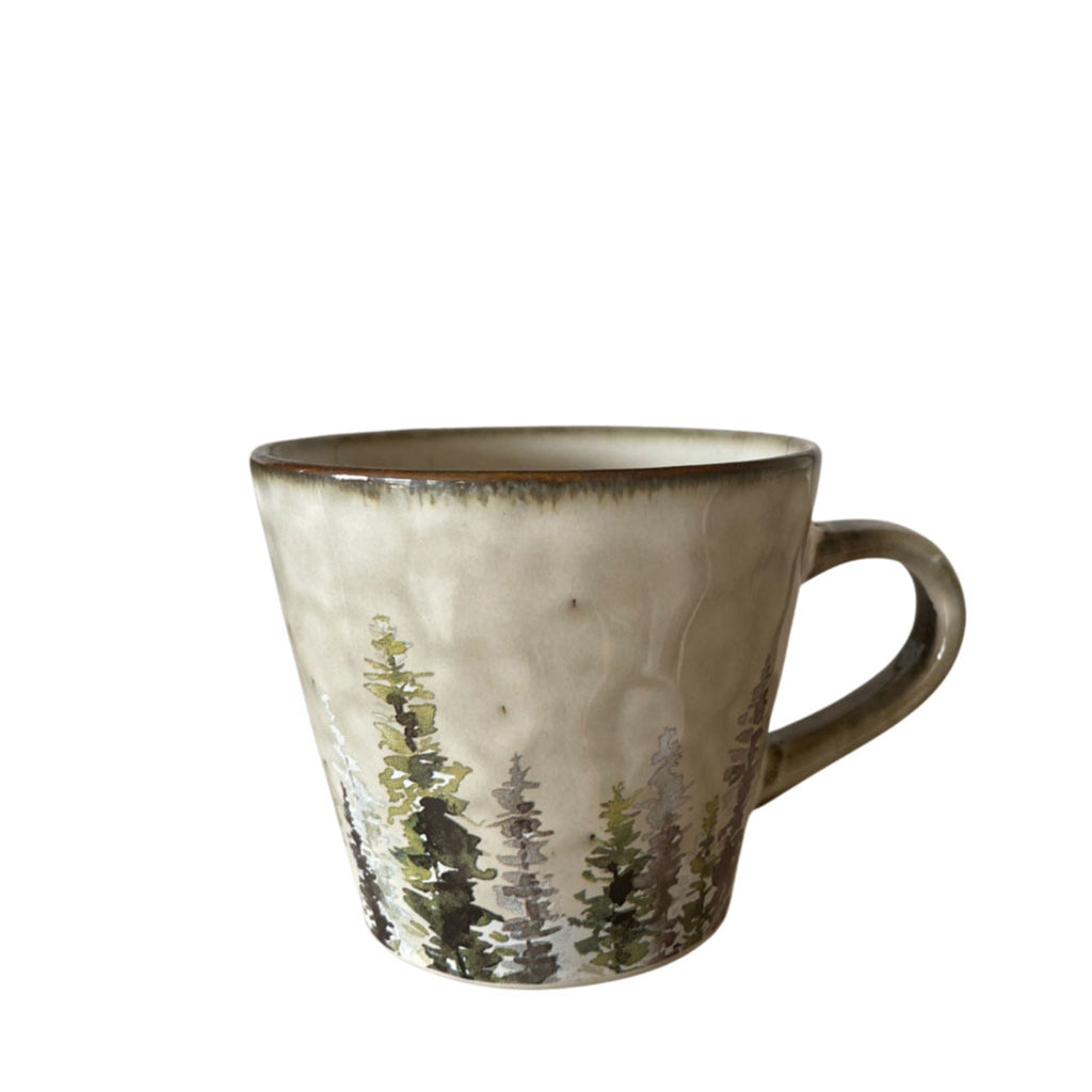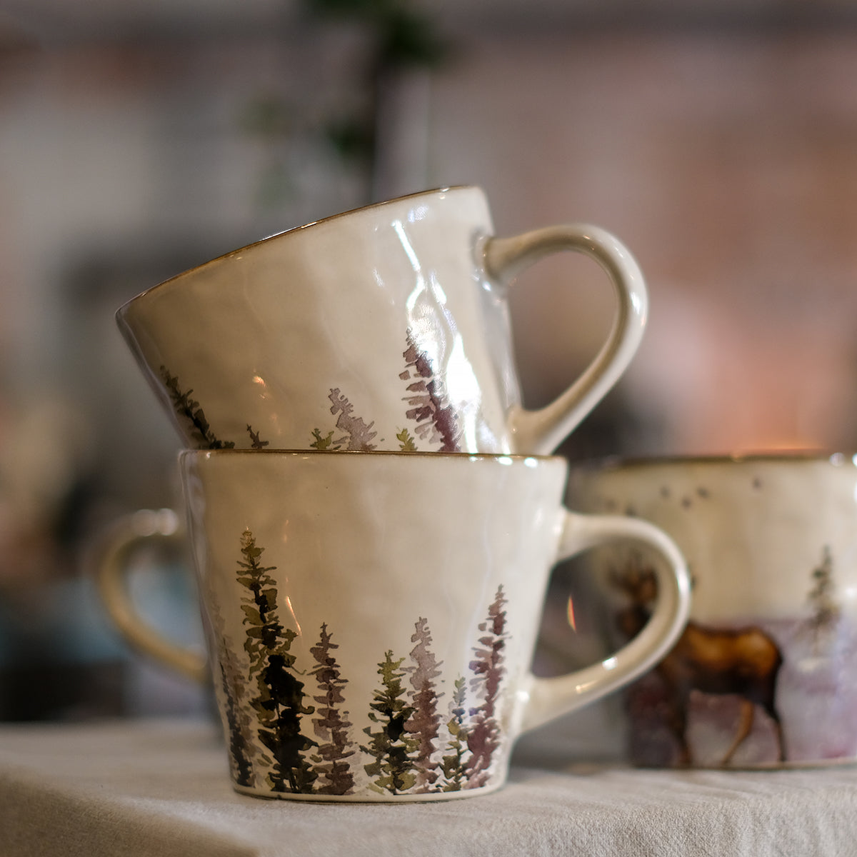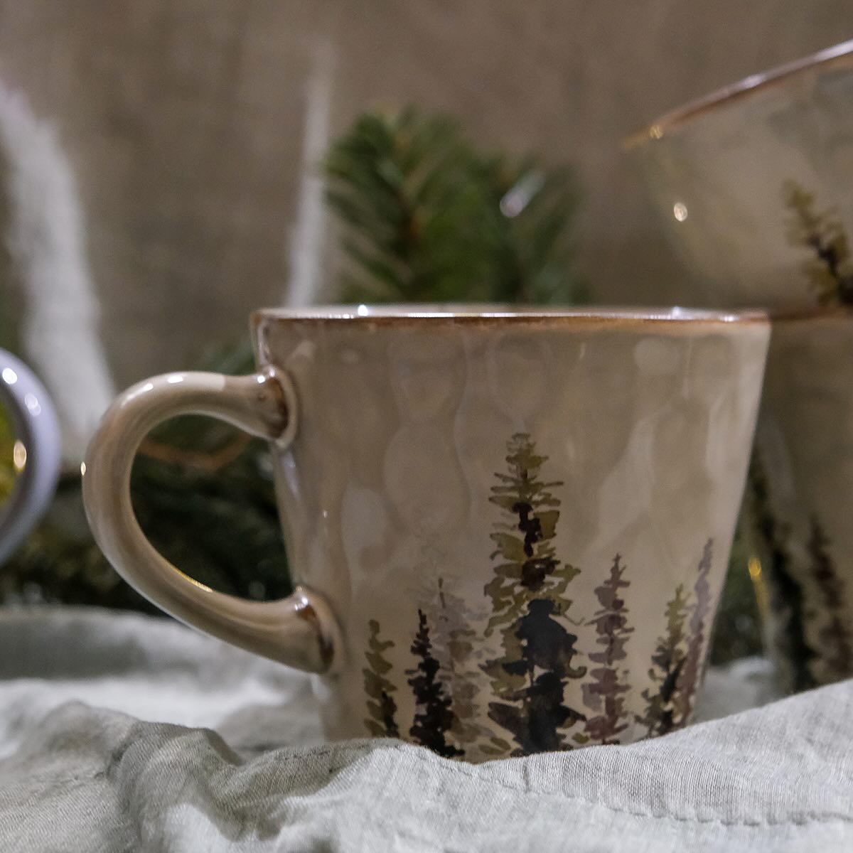Vinterns mysigaste mugg med ett mönster av en rogivande granskog.