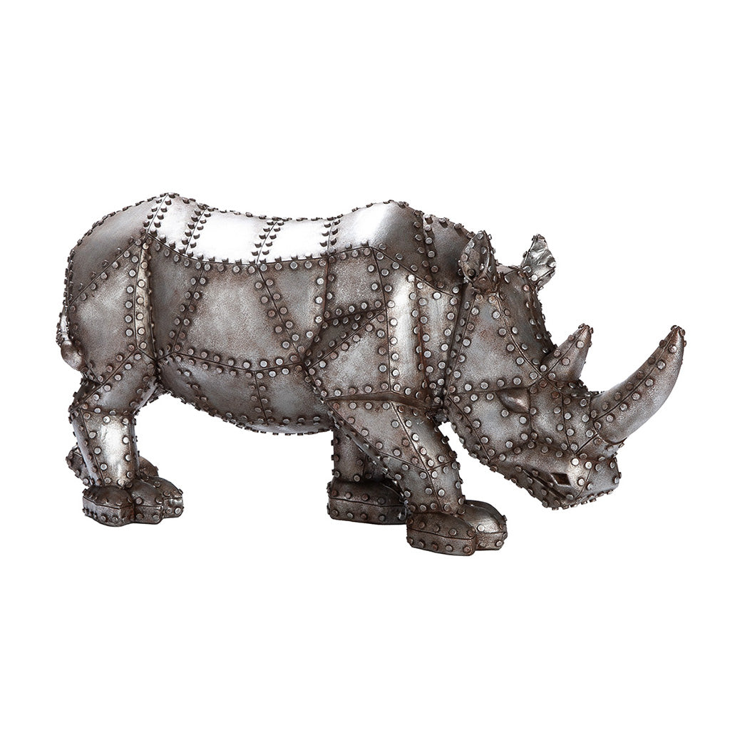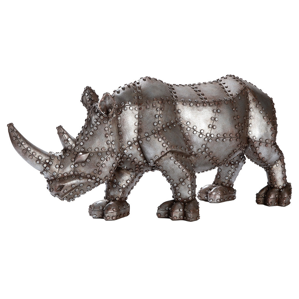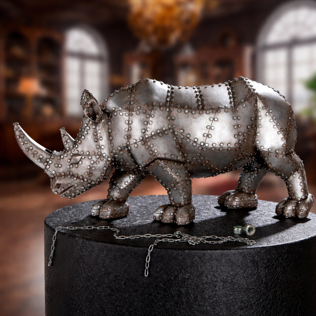En rejäl steampunk-noshörning full av nitar, plåtskarvar och rå attityd. Kroppen är uppbyggd som om den vore hopsatt av metallpaneler, med tydliga detaljer som ger ett tungt, industriellt uttryck. Den tar plats - det här är ingen diskret figur.