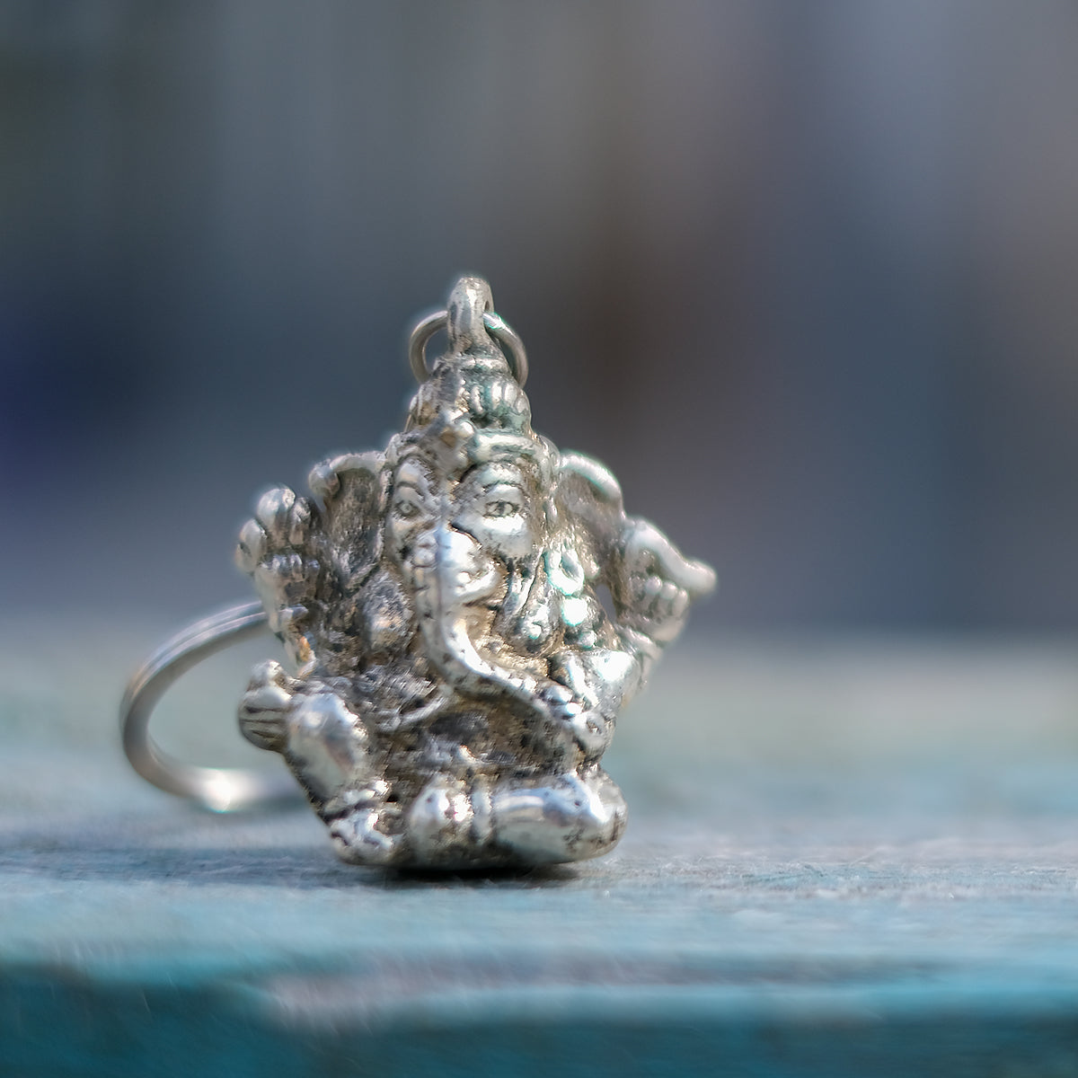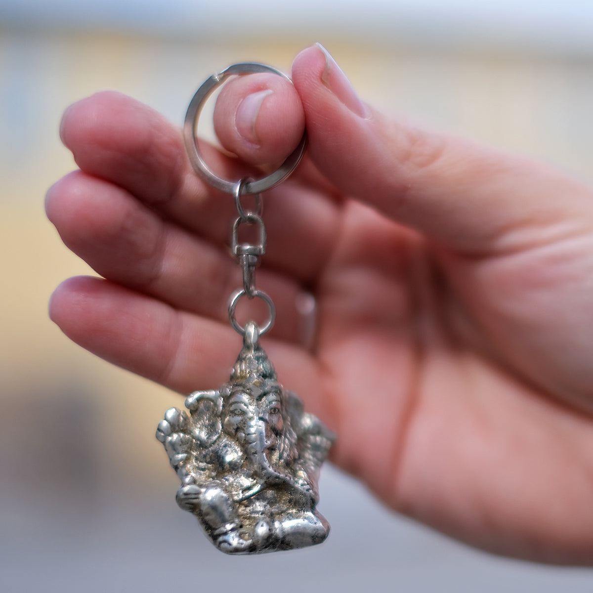 Nyckelring i silverfärgad metall med Ganesha - den älskade indiska guden med elefanthuvud som symboliserar visdom, framgång och nya möjligheter. Perfekt att ha i fickan eller väskan som en liten lyckobringare i vardagen, eller att ge bort till någon som står inför ett nytt kapitel i livet.