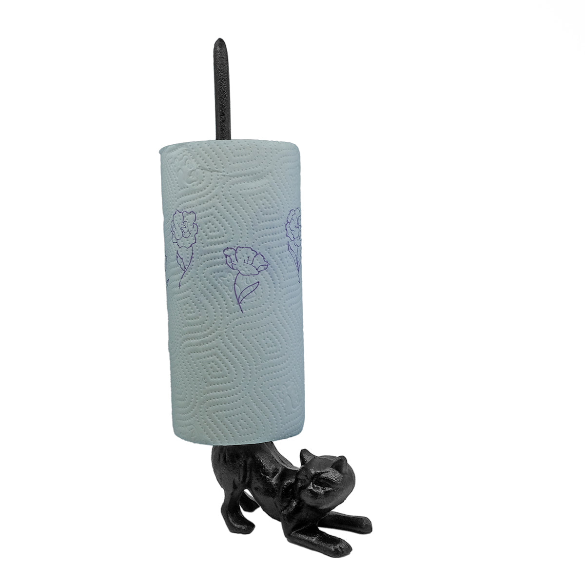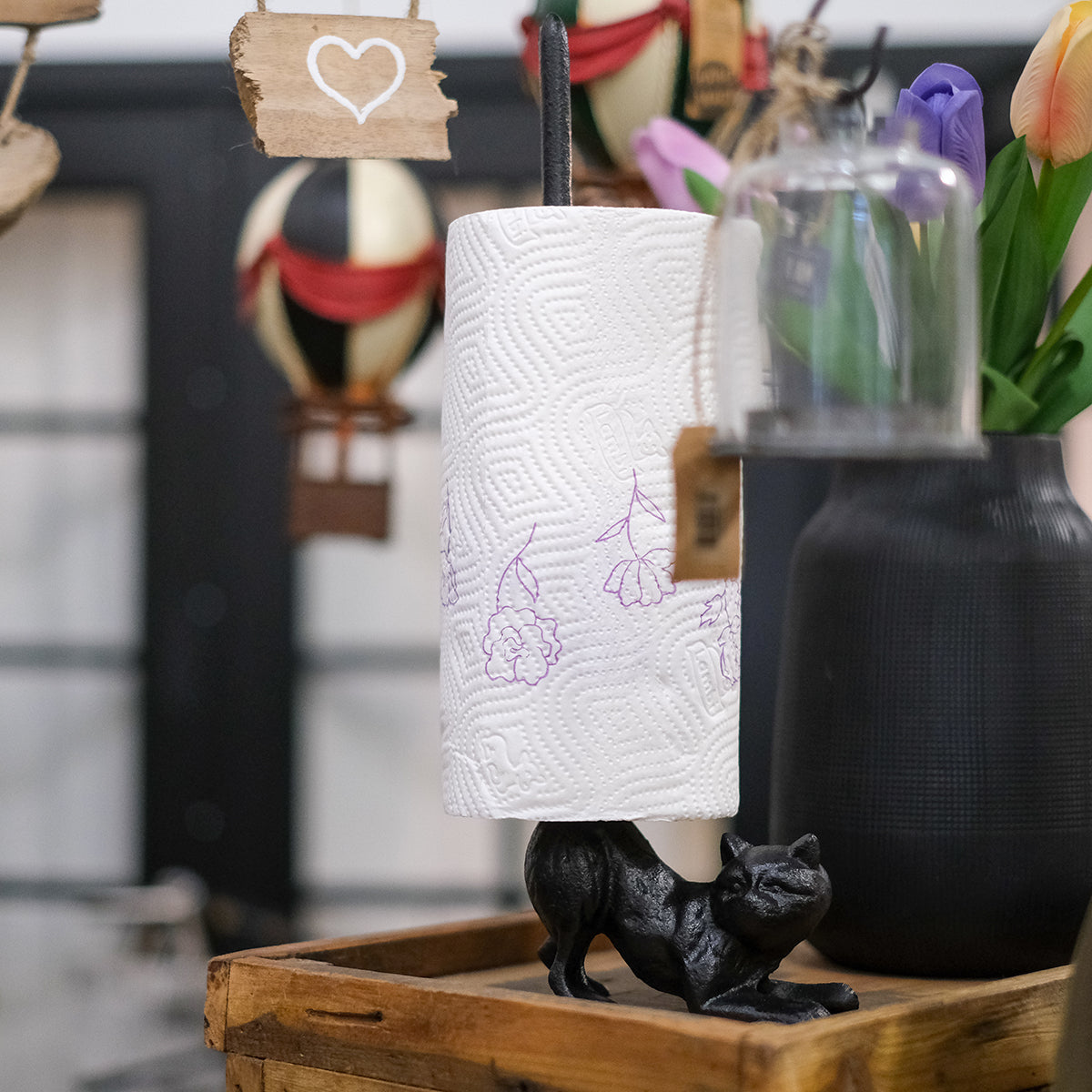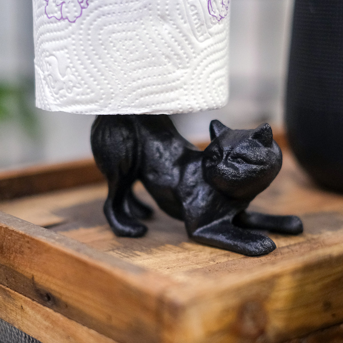 En rejäl och charmig hushållspappershållare i svart gjutjärn, där en stretchande katt utgör själva basen och svansen fungerar som hållare för rullen. Både funktionell och dekorativ - en perfekt detalj för köket, stugan eller uterummet. Tyngden i gjutjärnet gör att den står stadigt.