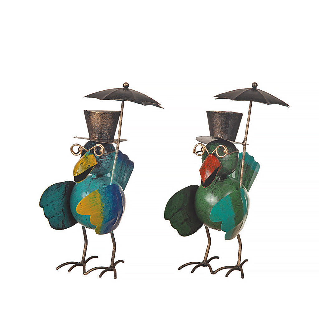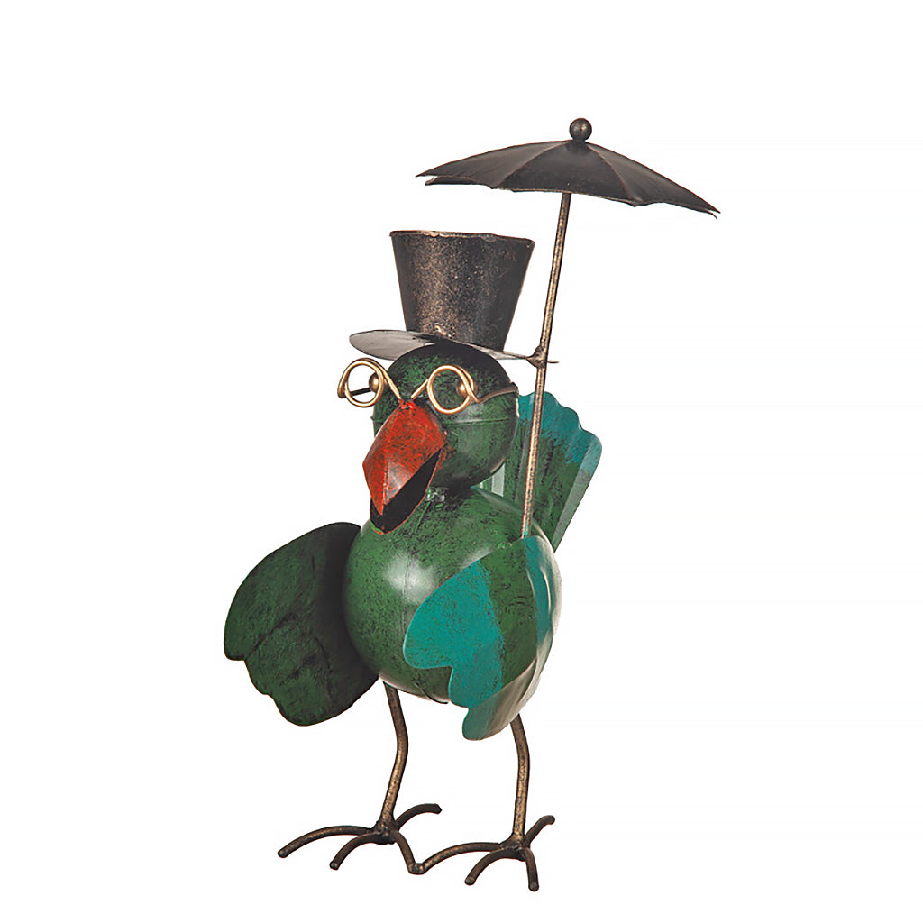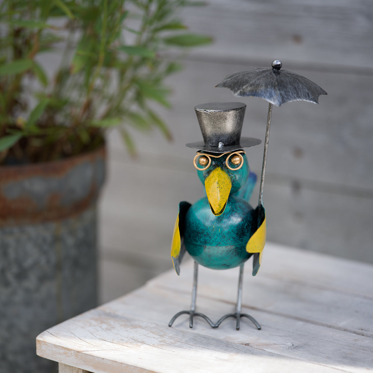 Våra plåtfåglar, med hög hatt, runda glasögon och ett paraply i näven (eller vingen), är som gjorda för att sprida ett leende var de än placeras.