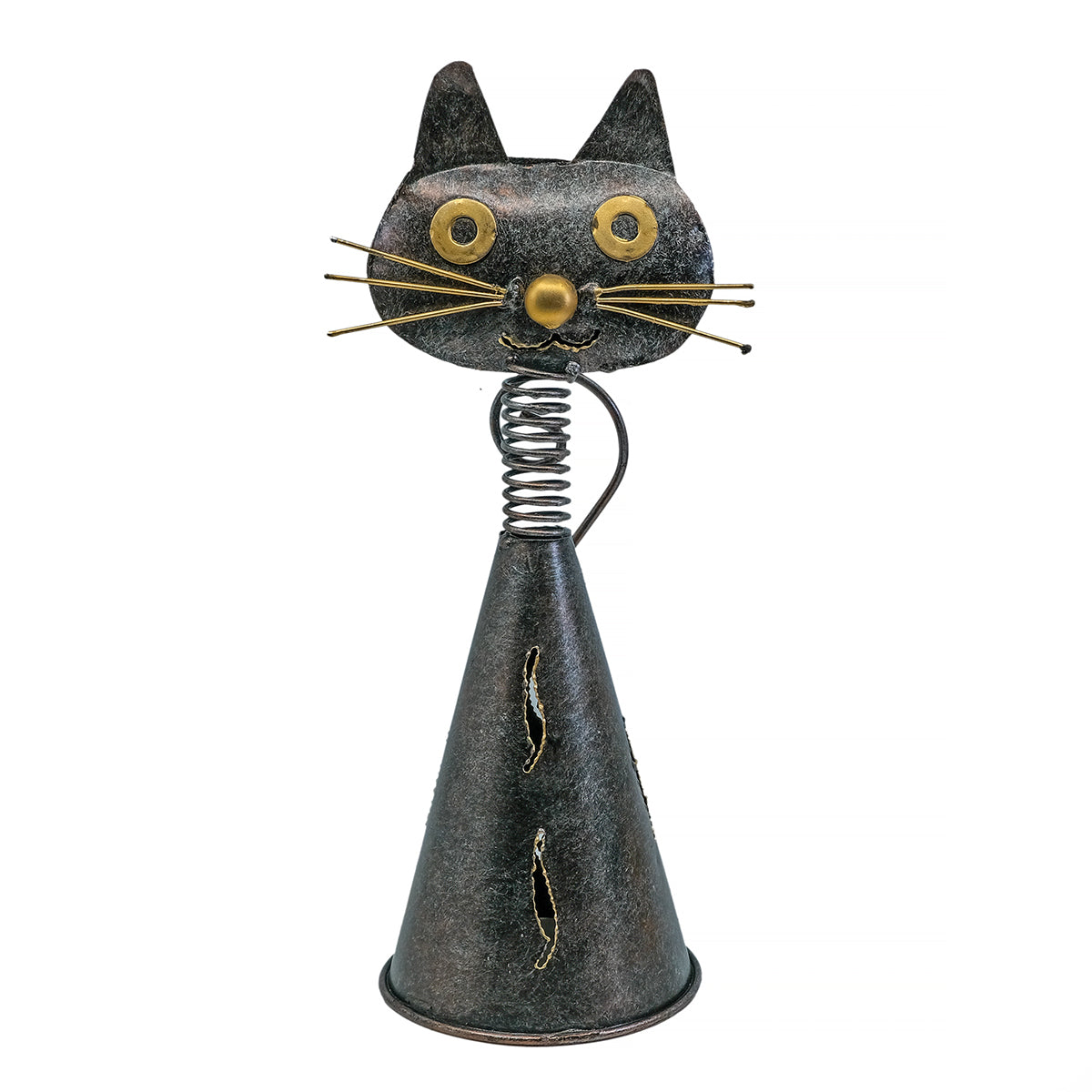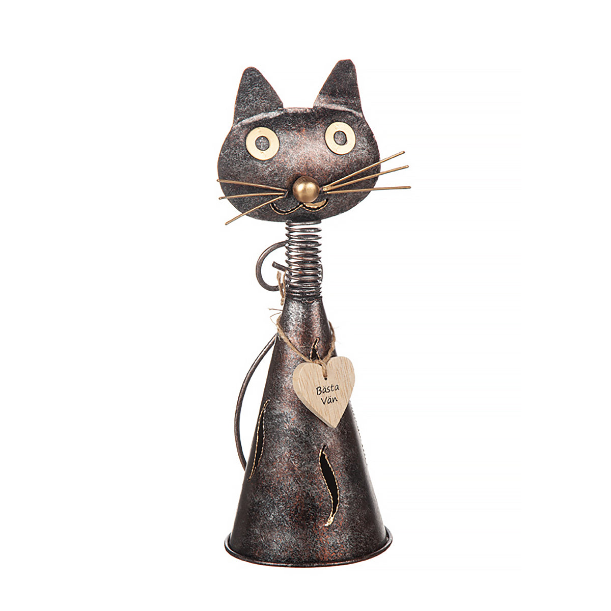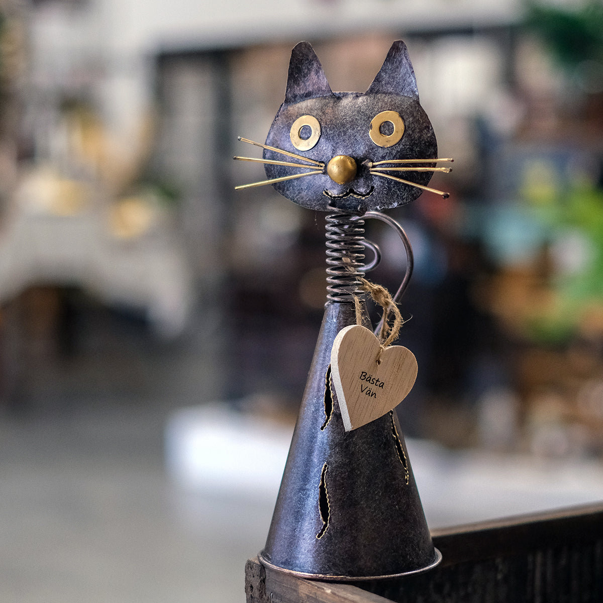 Dekorationskatt i plåt med rustik finish och ett lekfullt, gungande huvud vilket ger figuren ett extra charmigt uttryck. Den här glada plåtkatten är inte bara ett roligt blickfång - den bjuder också på en dos värme och personlighet i hemmet. Runt halsen hänger en hjärtformad träskylt med texten "Bästa vän", vilket gör den till en utmärkt gåva till någon du håller kär.