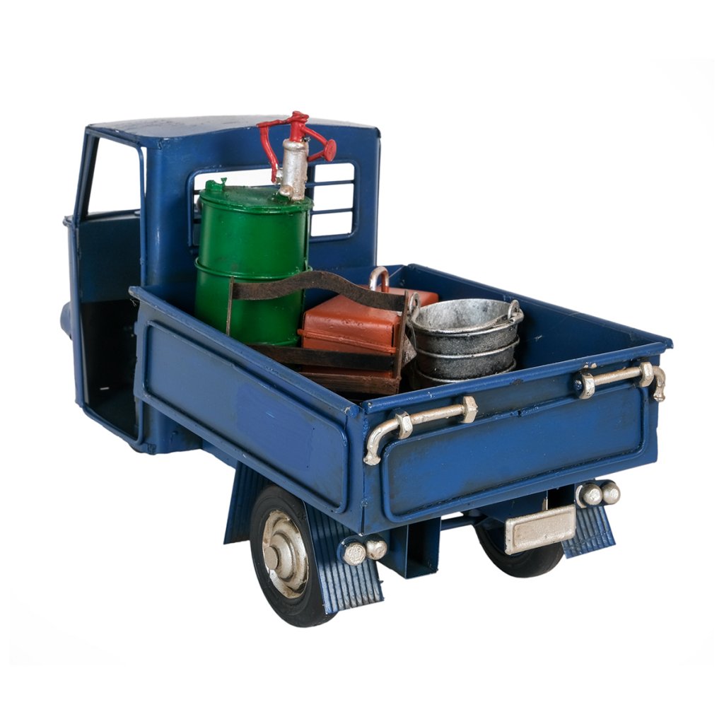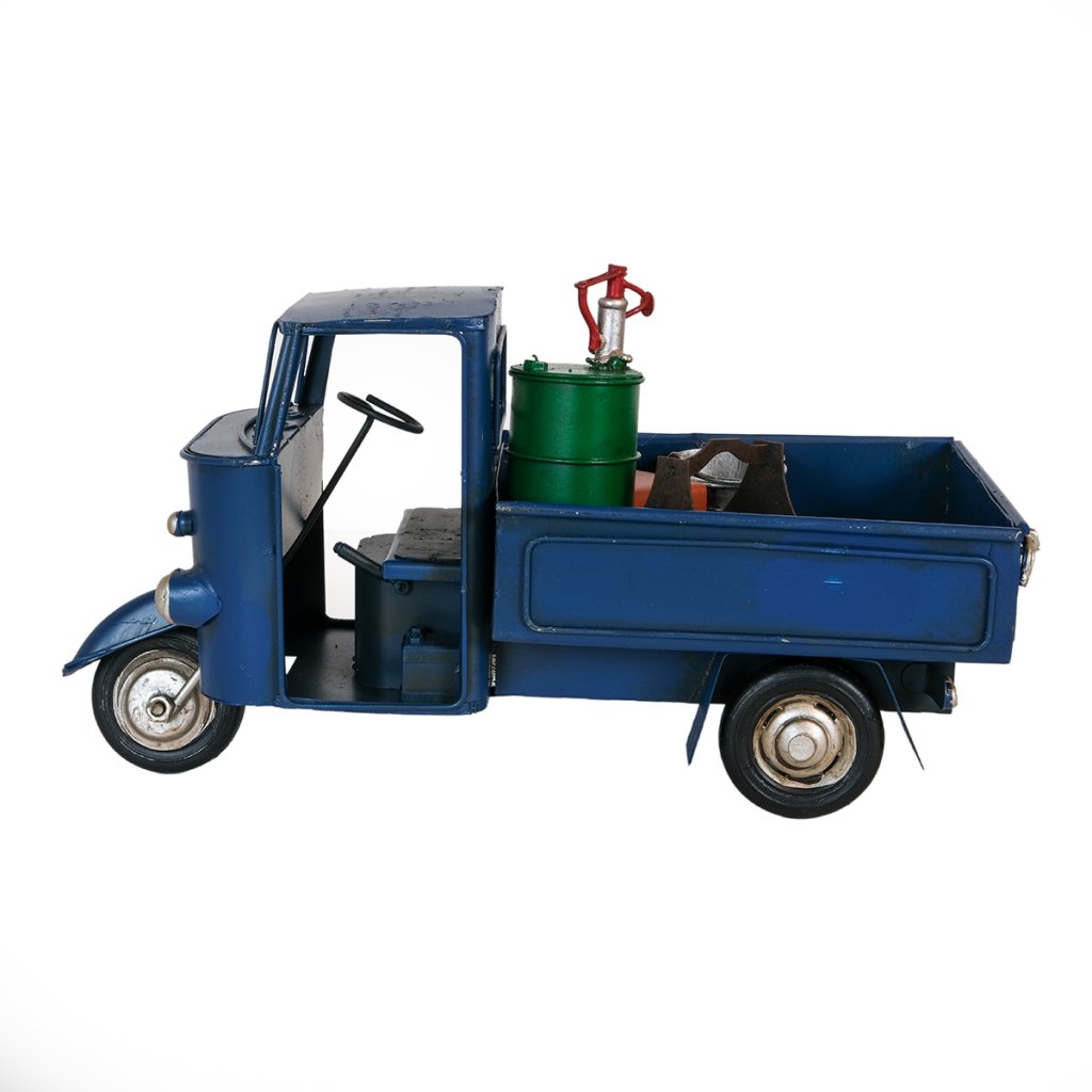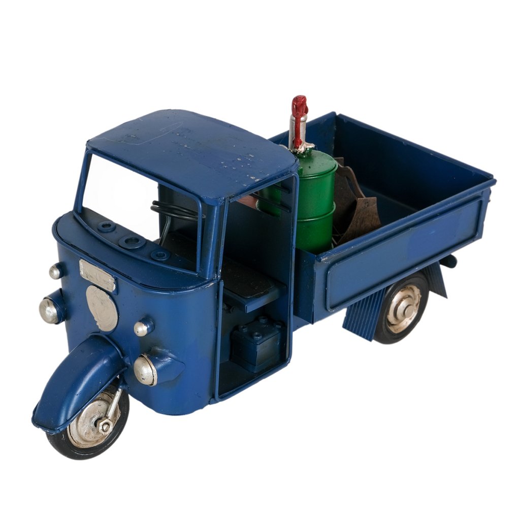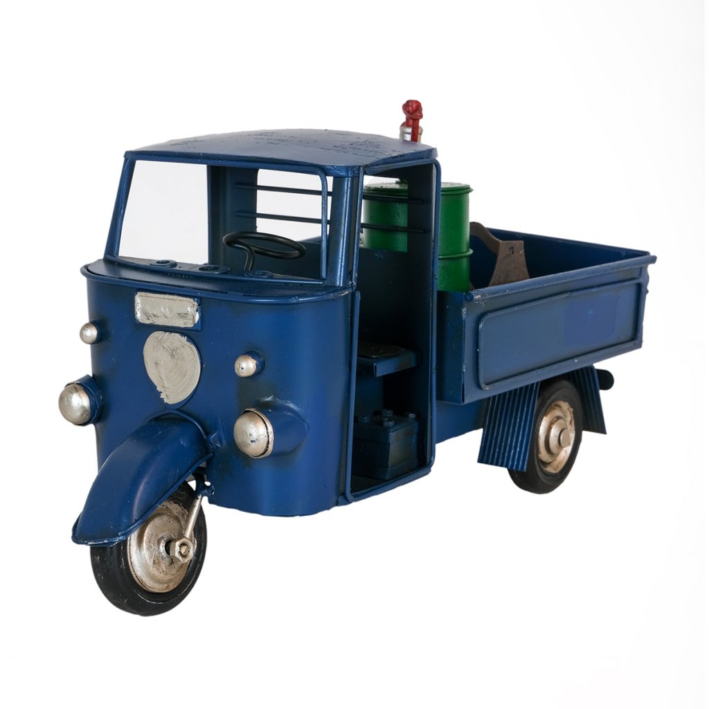 Den här plåt-replikan av en klassisk trehjulig transportbil är inspirerad av Italiens hårt arbetande ikon, Piaggio Ape – fordonet som i årtionden har kört genom smala gränder, slingrande kustvägar och livliga marknader. Med sin karakteristiska runda front och robusta lastyta har Ape blivit en symbol för italiensk småföretagsamhet och charmig vardagslogistik.