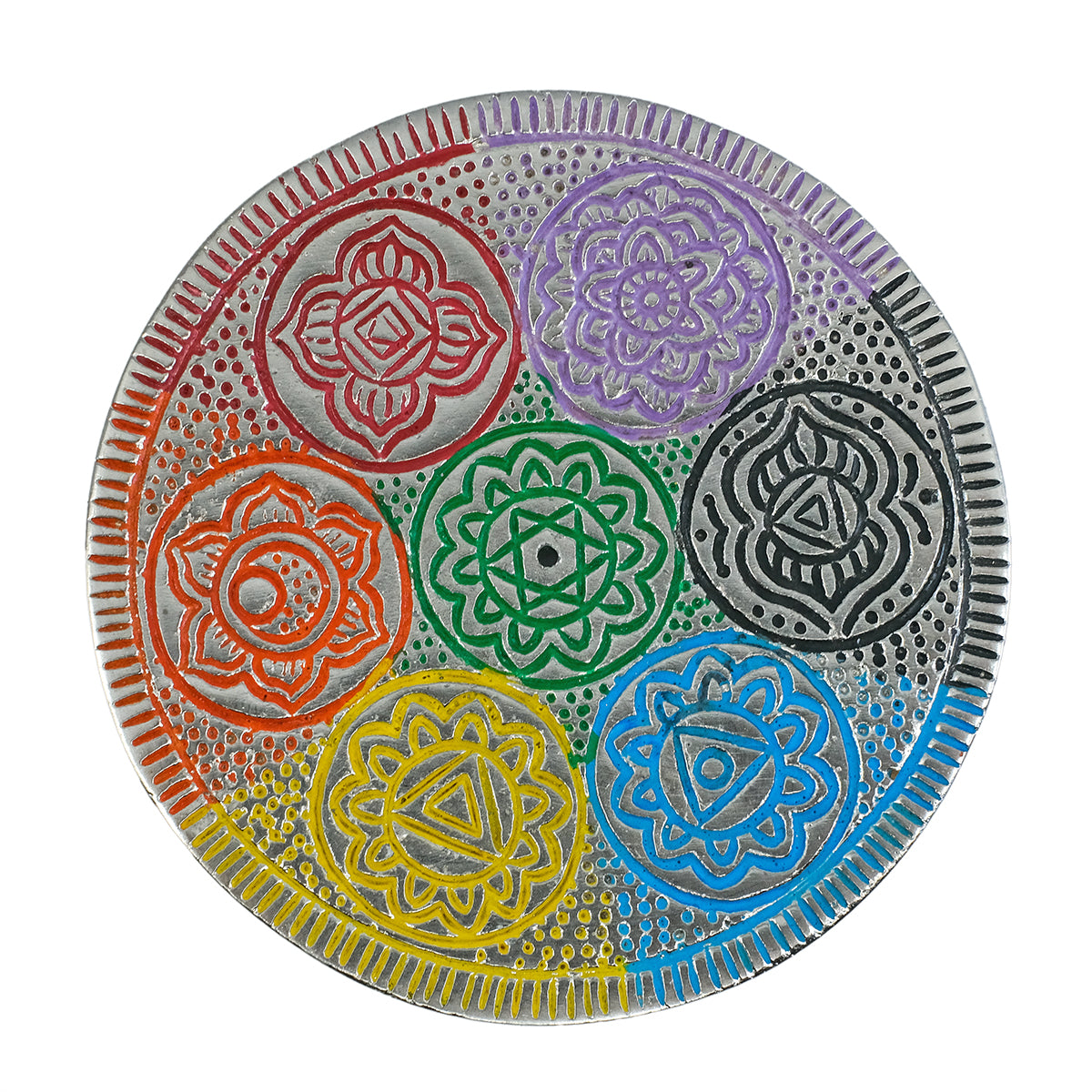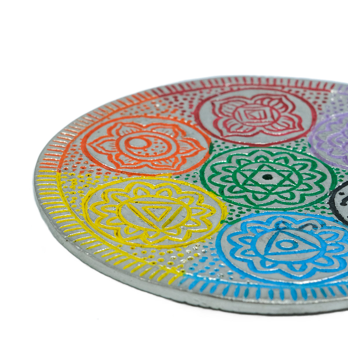 En vacker och färgstark rökelsehållare i metall, prydd med de sju chakrasymbolerna - var och en stansad och målad i sin respektive färg. Perfekt för dig som vill förena rökelsens doft med en stund av balans, meditation och harmoni.