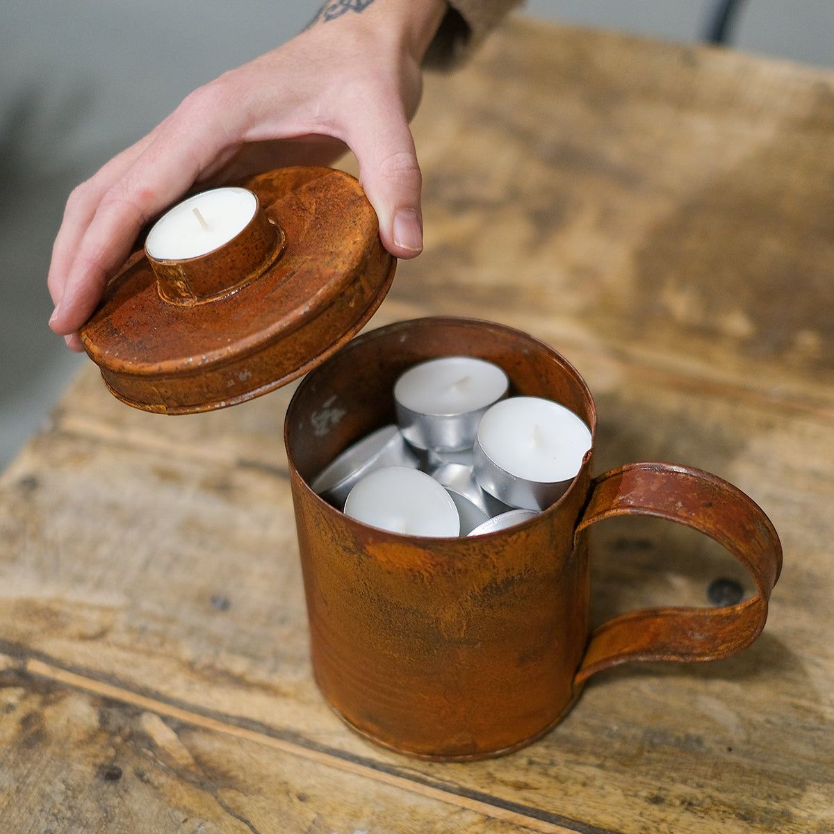 Den här charmiga burken i rostig metall är både ljusstake och förvaring i ett. Förvara dina värmeljus snyggt och lättillgängligt i burken - och använd locket som hållare när du tänder ett ljus.