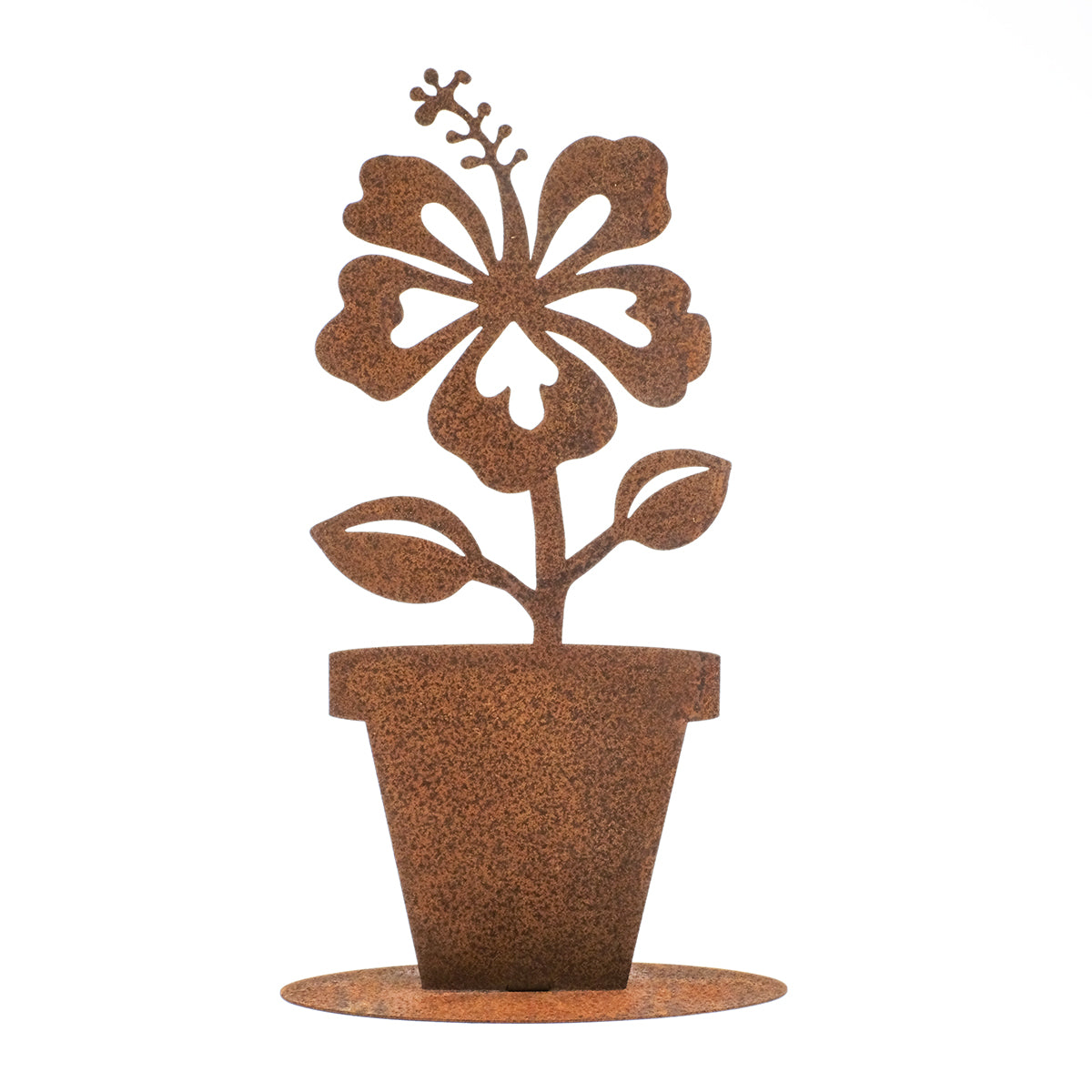En charmig dekoration i rostig metall som föreställer en hibiskus i kruka. Fin i fönstret där den fångar ljuset, men passar lika bra på en hylla eller i uterummet. Den rostiga ytan ger ett varmt och levande uttryck som gör att den lätt går att kombinera med andra dekorationer i samma stil.