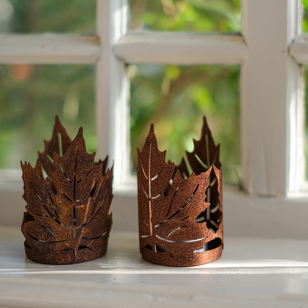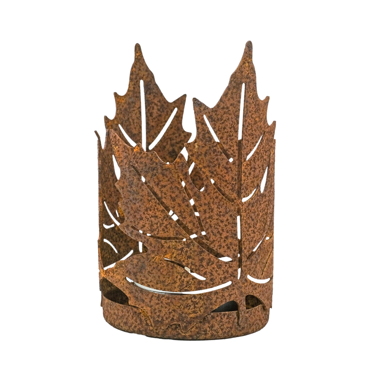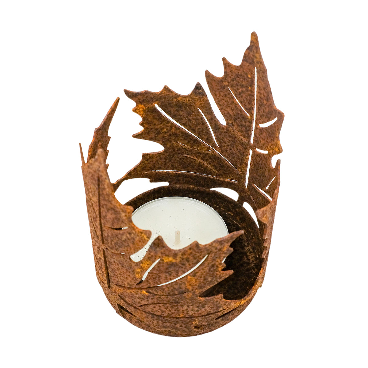 Stämningsfull värmeljushållare i form av utskurna lönnlöv. Den rostiga ytan ger ett levande sken när ljuset tänds, och passar lika fint på middagsbordet, i fönstret eller ute på balkongen en mörk kväll.