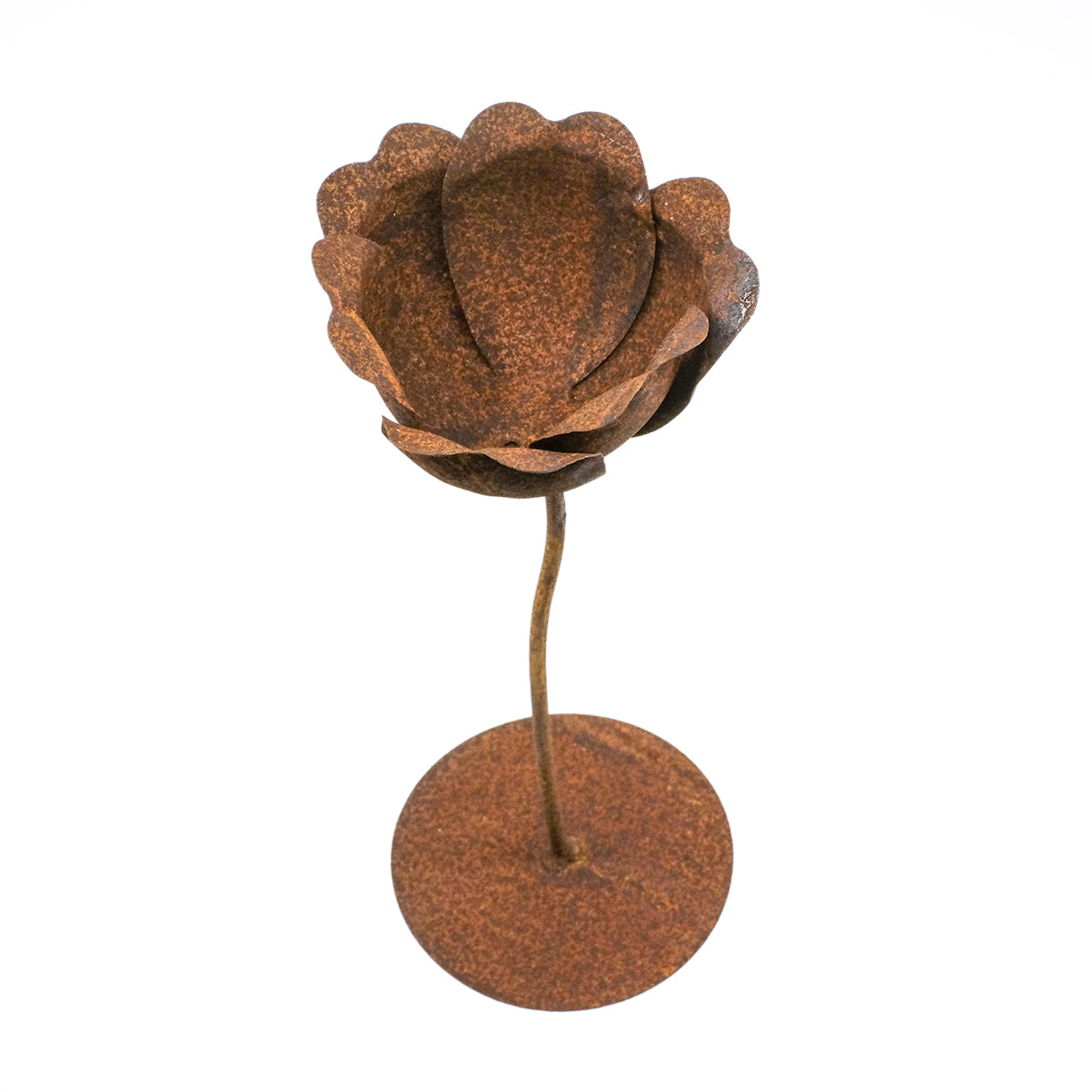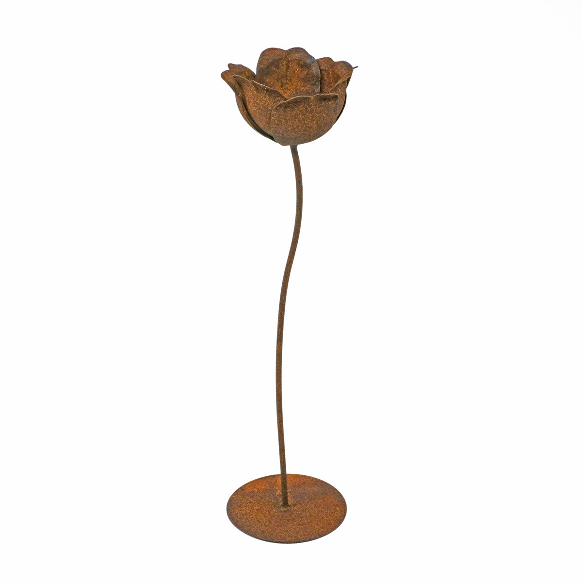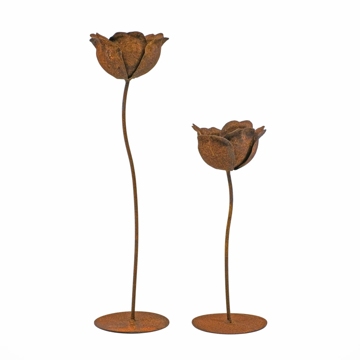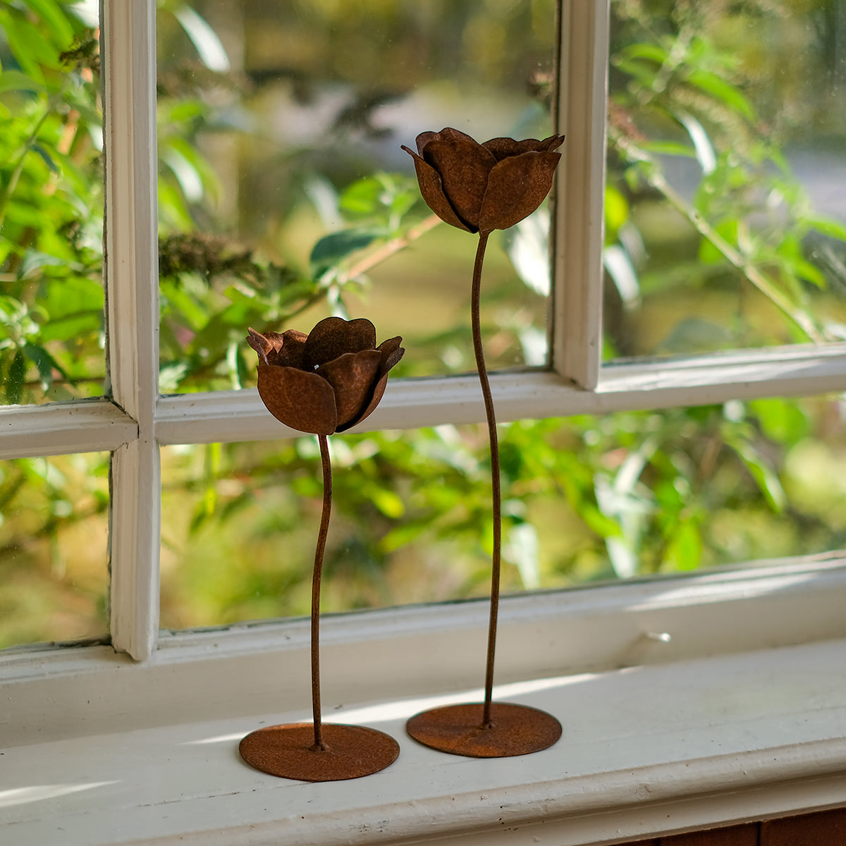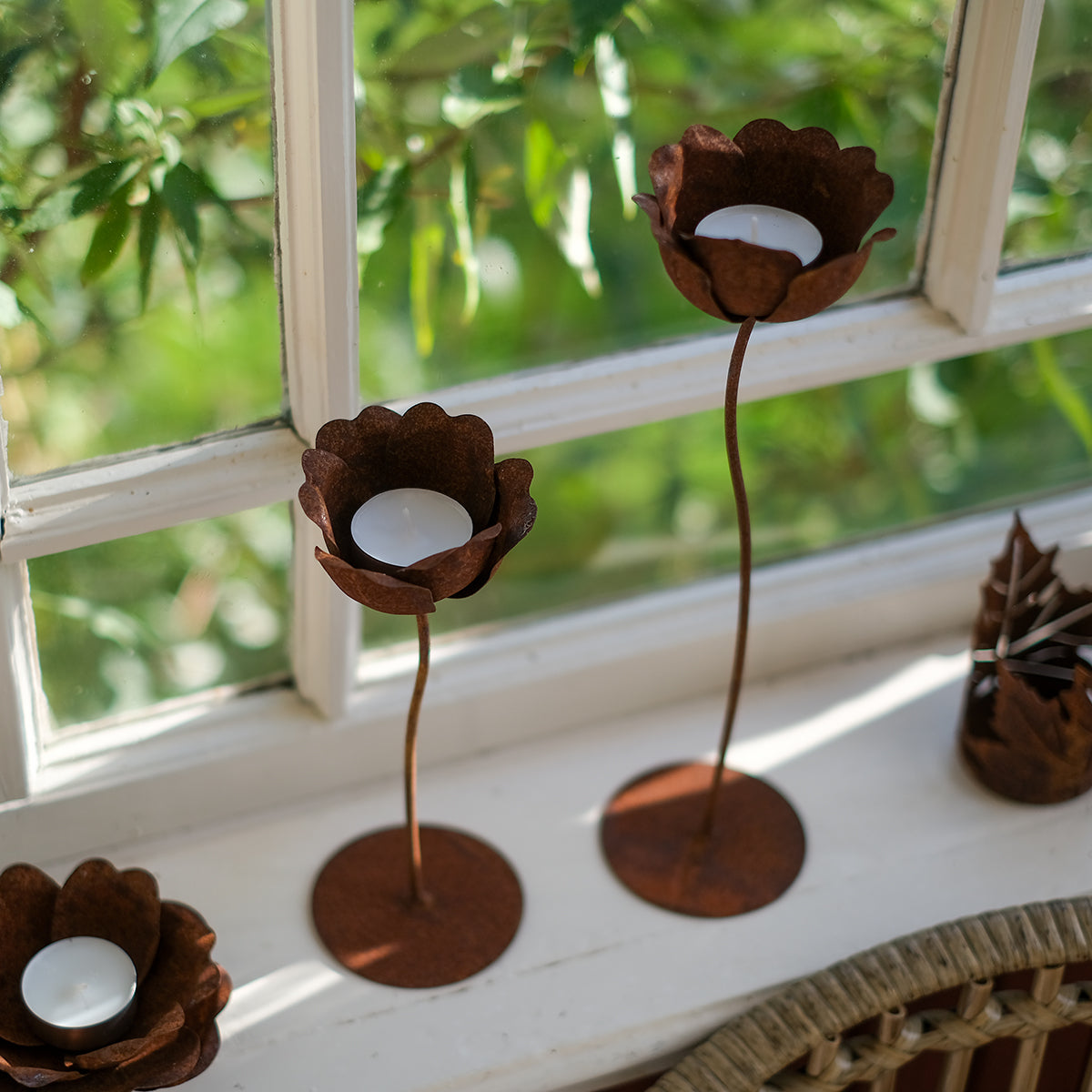 Ståtlig och charmig värmeljusstake i form av en vallmo, med vackra rostiga kronblad. Finns i två olika höjder - lika fina var för sig men allra härligast när de får stå tillsammans. Perfekta i ett fönster, på bordet eller ute i trädgården där de sprider både ljus och stämning.