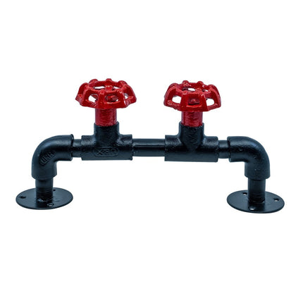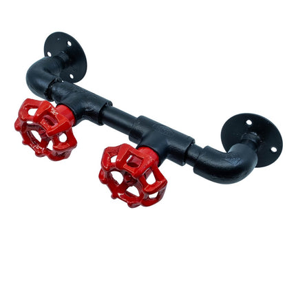 Tuff väggkrok i industriell stil med två röda vred att hänga saker på.