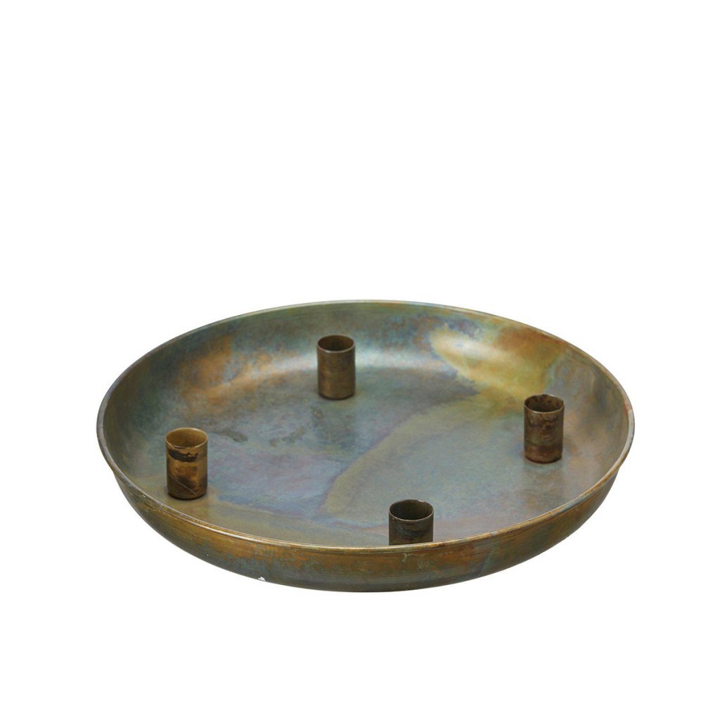 Rund bricka i antik grön finish med fyra ljushållare.