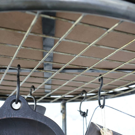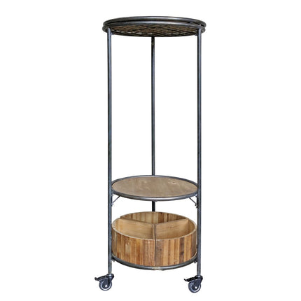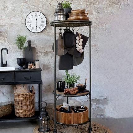 Tack vare sin höjd och runda design blir vagnen både en praktisk och estetisk möbel som enkelt kan flyttas dit den behövs. Den översta hyllan kan tas av och användas som bricka, vilket ger ännu fler funktioner till vagnen. Dessutom är den utrustad med ett metallgaller under den översta hyllan där du enkelt kan hänga upp föremål som köksredskap eller handdukar med hjälp av krokar.