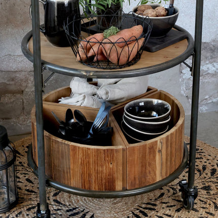 Mobil exponeringsvagn med tre hyllor och trälådor – ett funktionellt och stilrent förvaringsalternativ