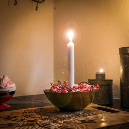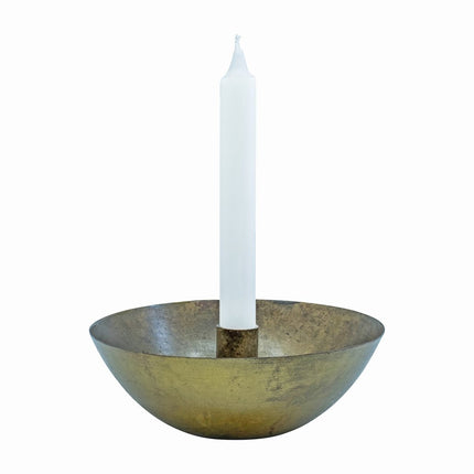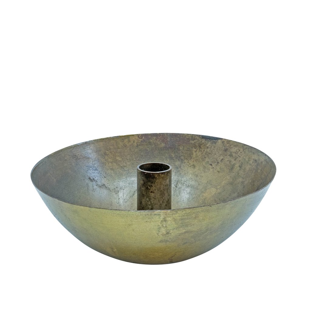 Enkel rund skål i antik mässing-finish med hållare för stearinljus.