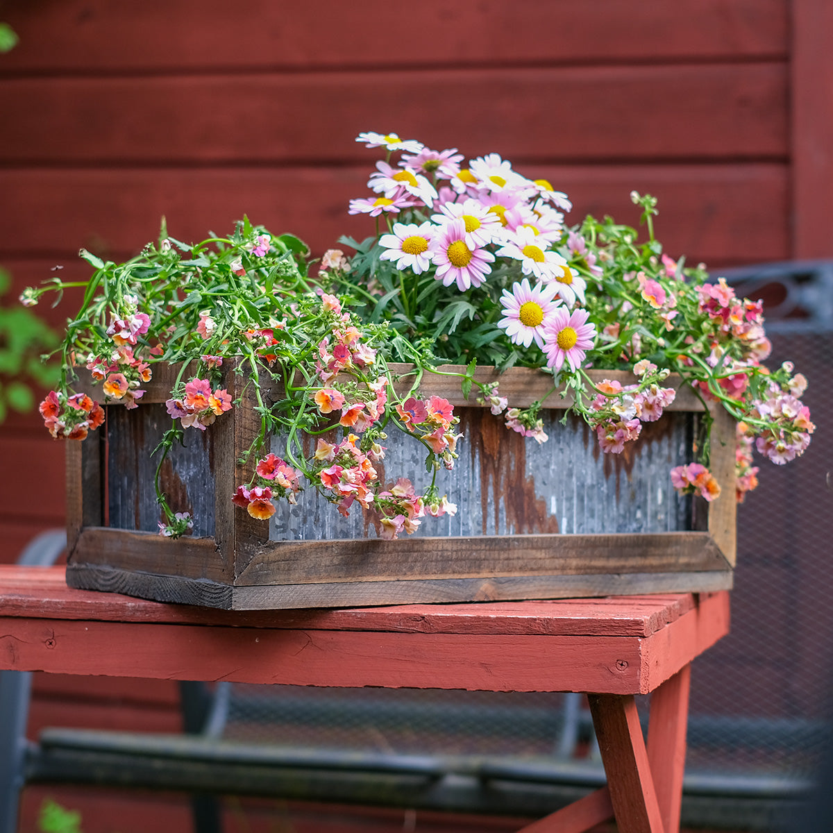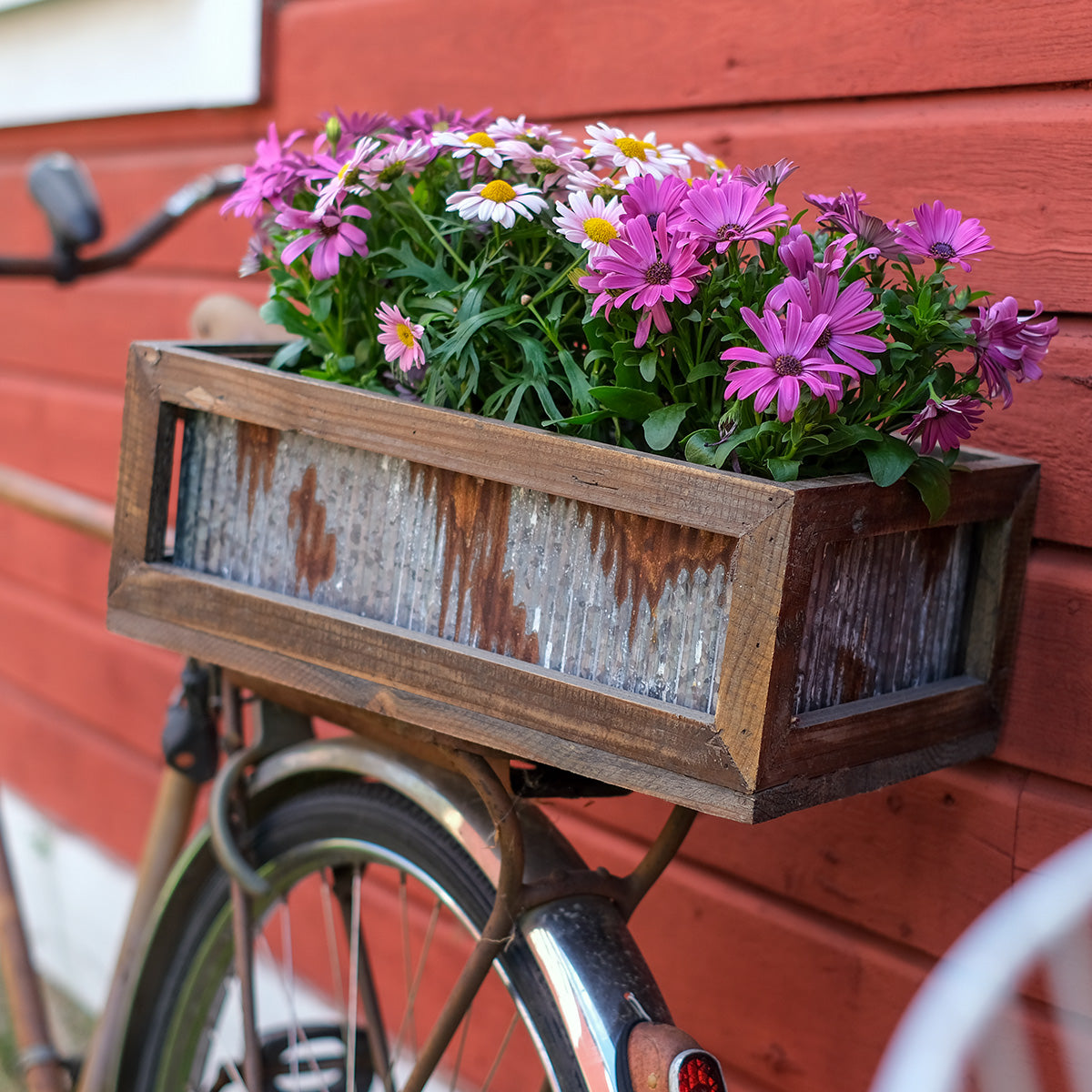 Charmiga och praktiska lådor i rustikt trä med sidor av patinerad, korrugerad zink. Varje låda är unik med spår av tidens tand.