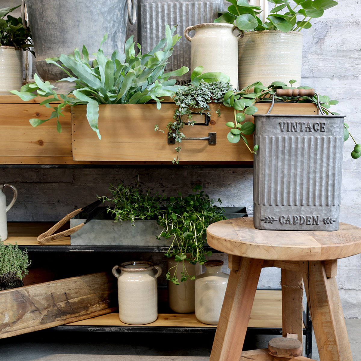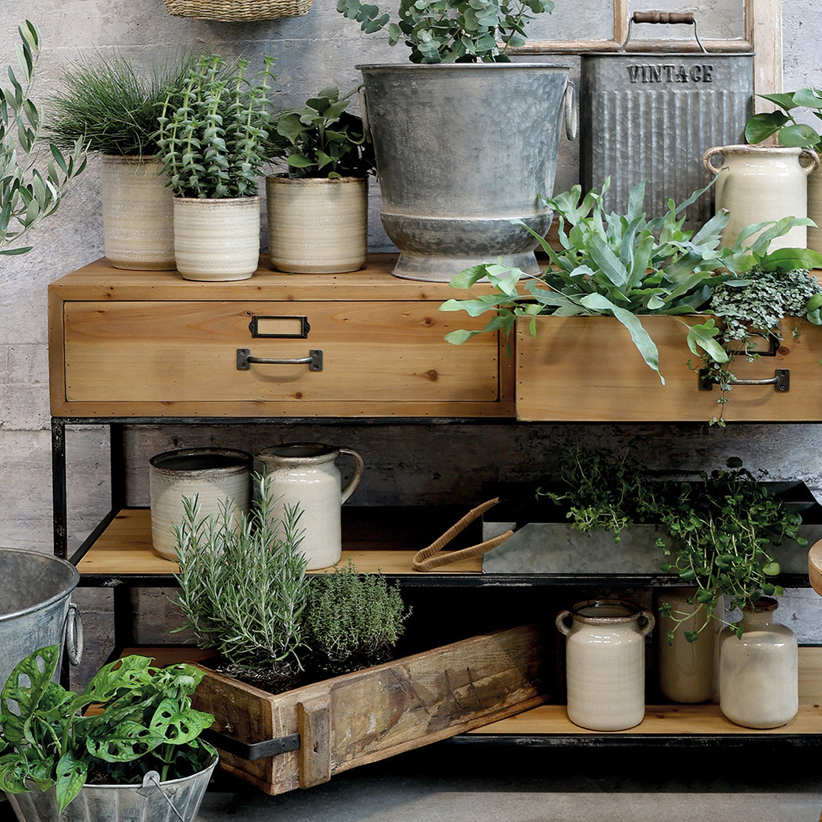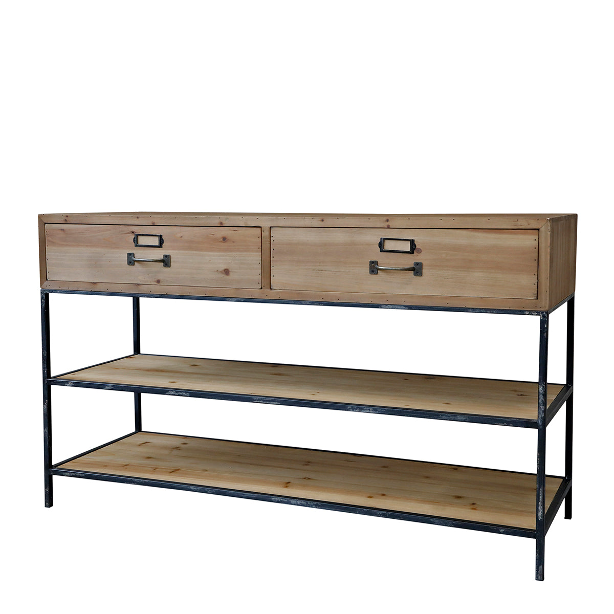 Ett charmigt sideboard som kombinerar rustikt trä med svart metallram i klassisk industristil. De två rymliga lådorna ger plats åt småsaker, medan hyllplanen nertill passar för större förvaring eller dekorativa arrangemang. Perfekt i hallen, vardagsrummet eller uterummet där du vill ha både funktion och karaktär.
