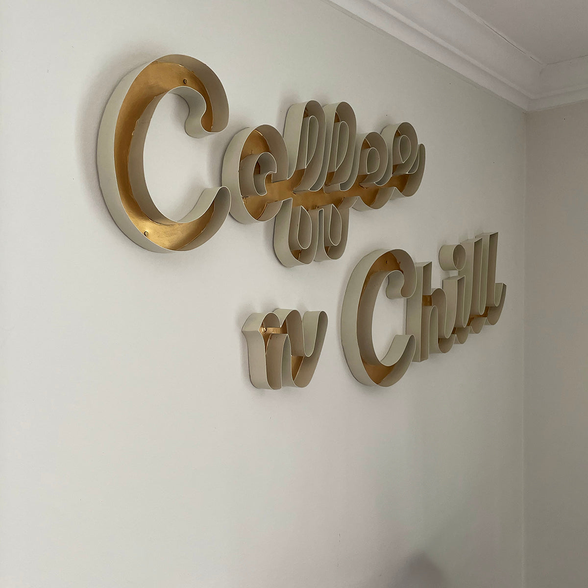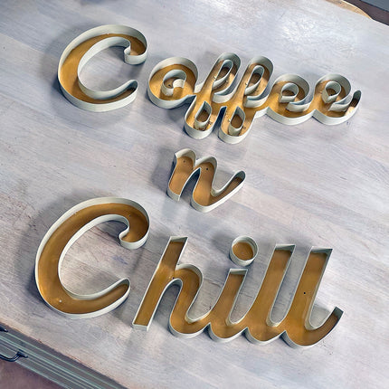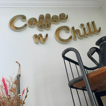 Skapa café-känsla hemma med denna snygga väggskylt i tre delar med texten ”coffee n chill”. Tillverkad i metall med djup och charm - den guldfärgade insidan ger en varm, inbjudande effekt. Skylten har förborrade hål för enkel uppsättning.