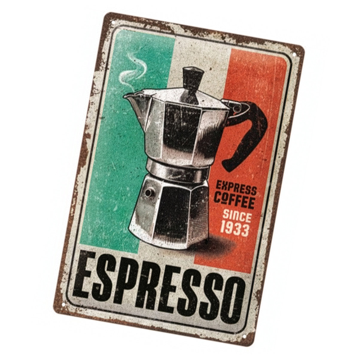 En hyllning till den italienska kaffekulturen! Med trikolorens färger, den klassiska mokabryggaren och slitna vintagekanter fångar skylten känslan av en liten espressobar i Rom. Perfekt för köket, caféet eller kaffehörnan hemma.