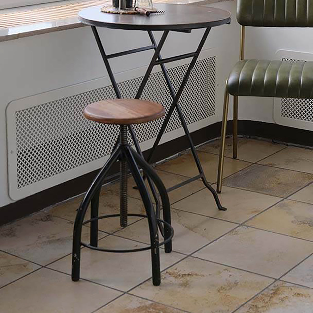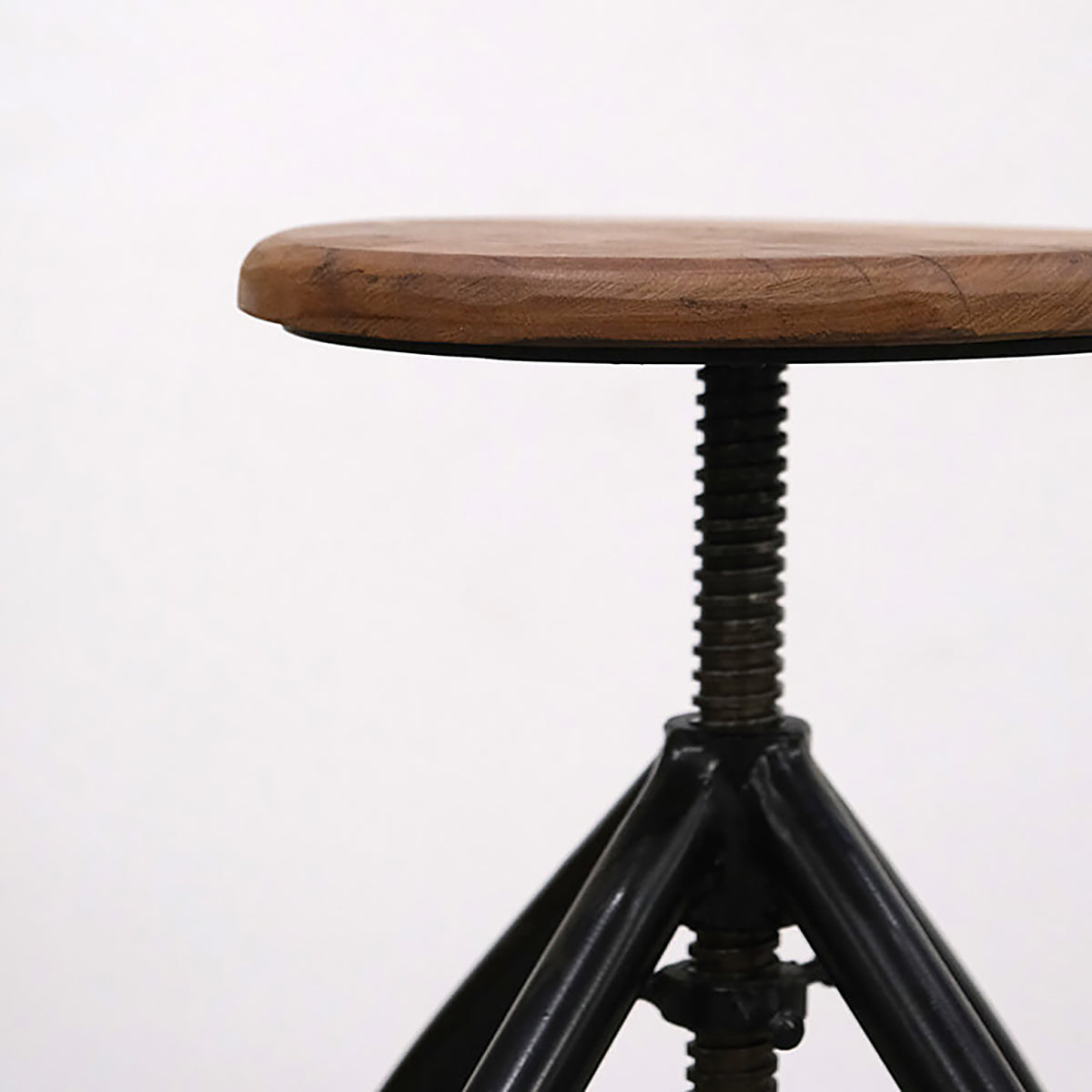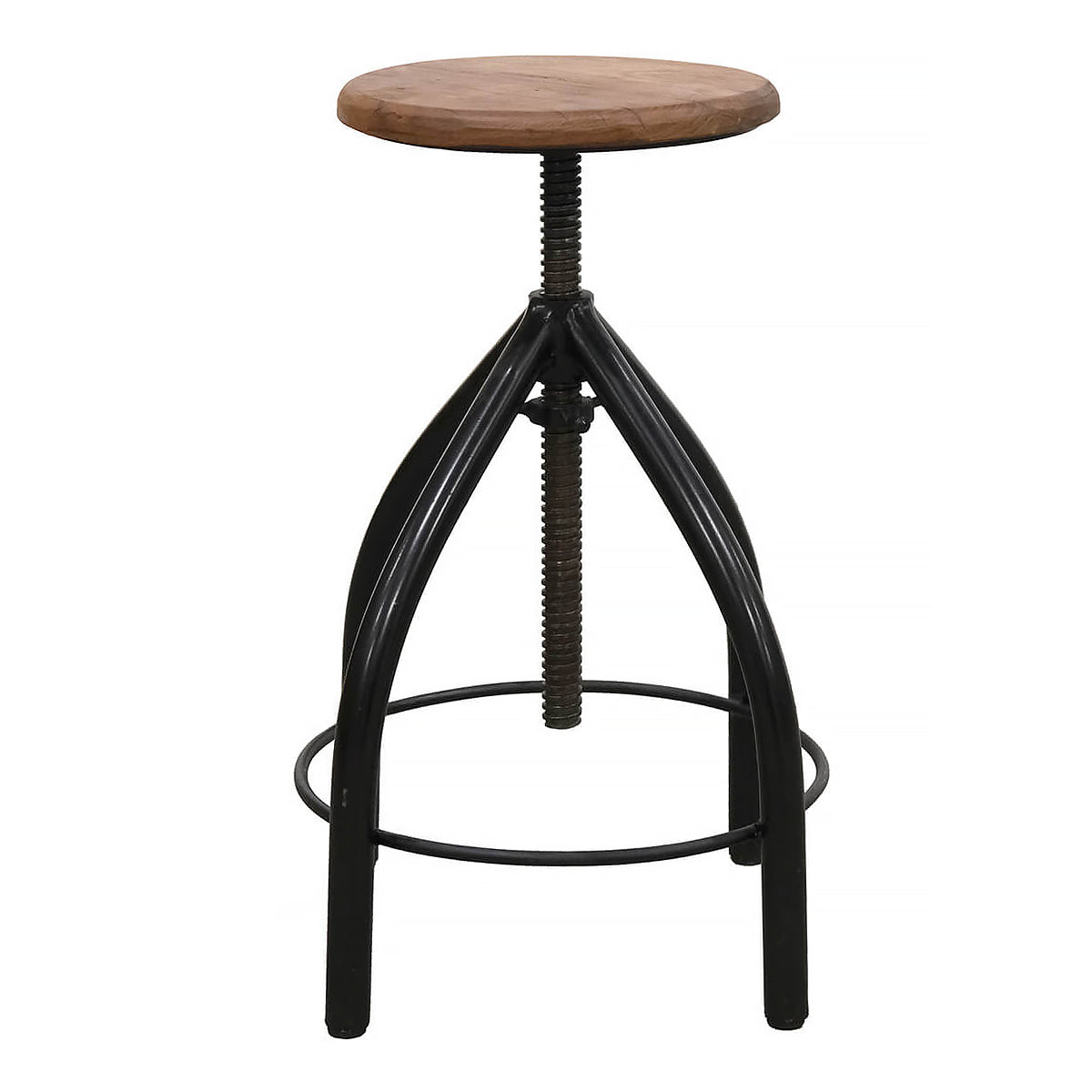 En industriell snurrpall i svart järn med rund sits i återvunnet trä. Pallen är höj- och sänkbar (41–62 cm) och kan enkelt anpassas efter behov.
