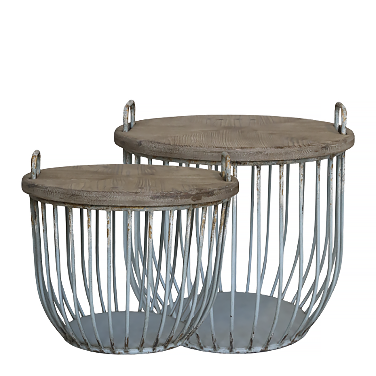 Detta set med två soffbord kombinerar en industriell känsla med praktiska funktioner. De har en stomme i patinerad svart metall och bordsskivor av vackert cypresträ, vars ådring ger en naturlig och charmig karaktär. Tillsammans skapar materialen ett stilrent uttryck som passar i många hem.