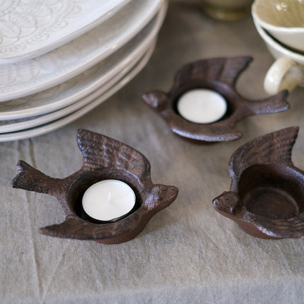 Mysig värmeljushållare i gjutjärn föreställande en svala.