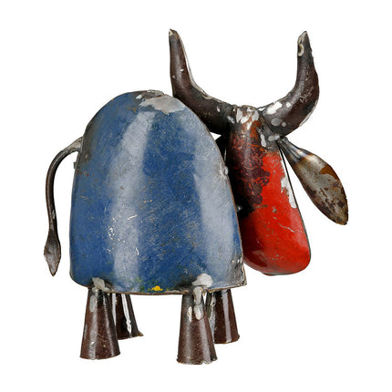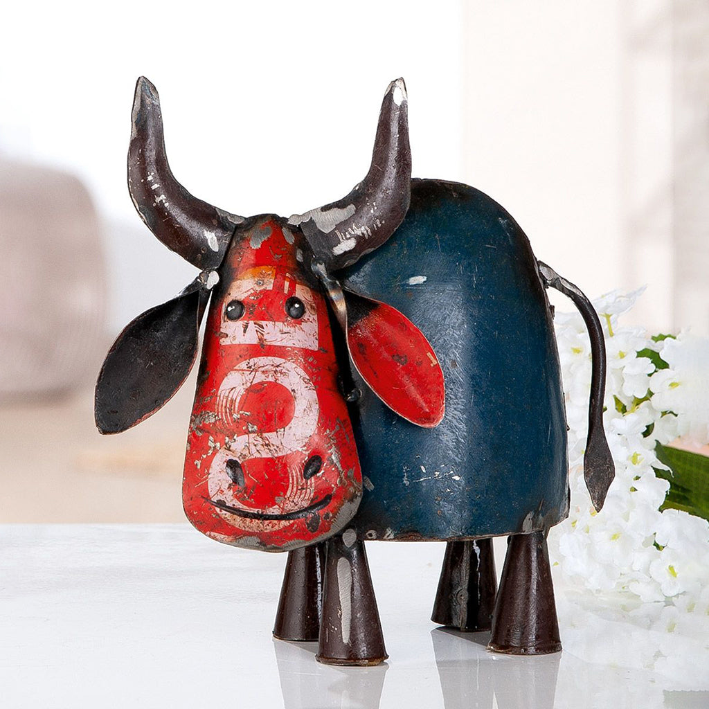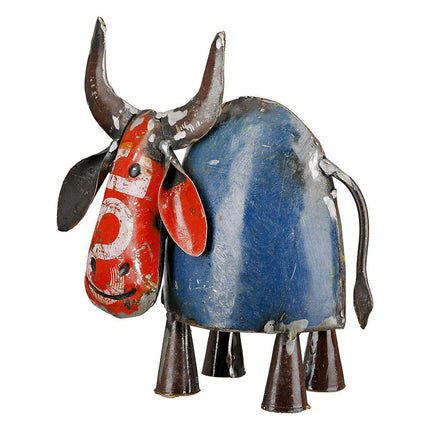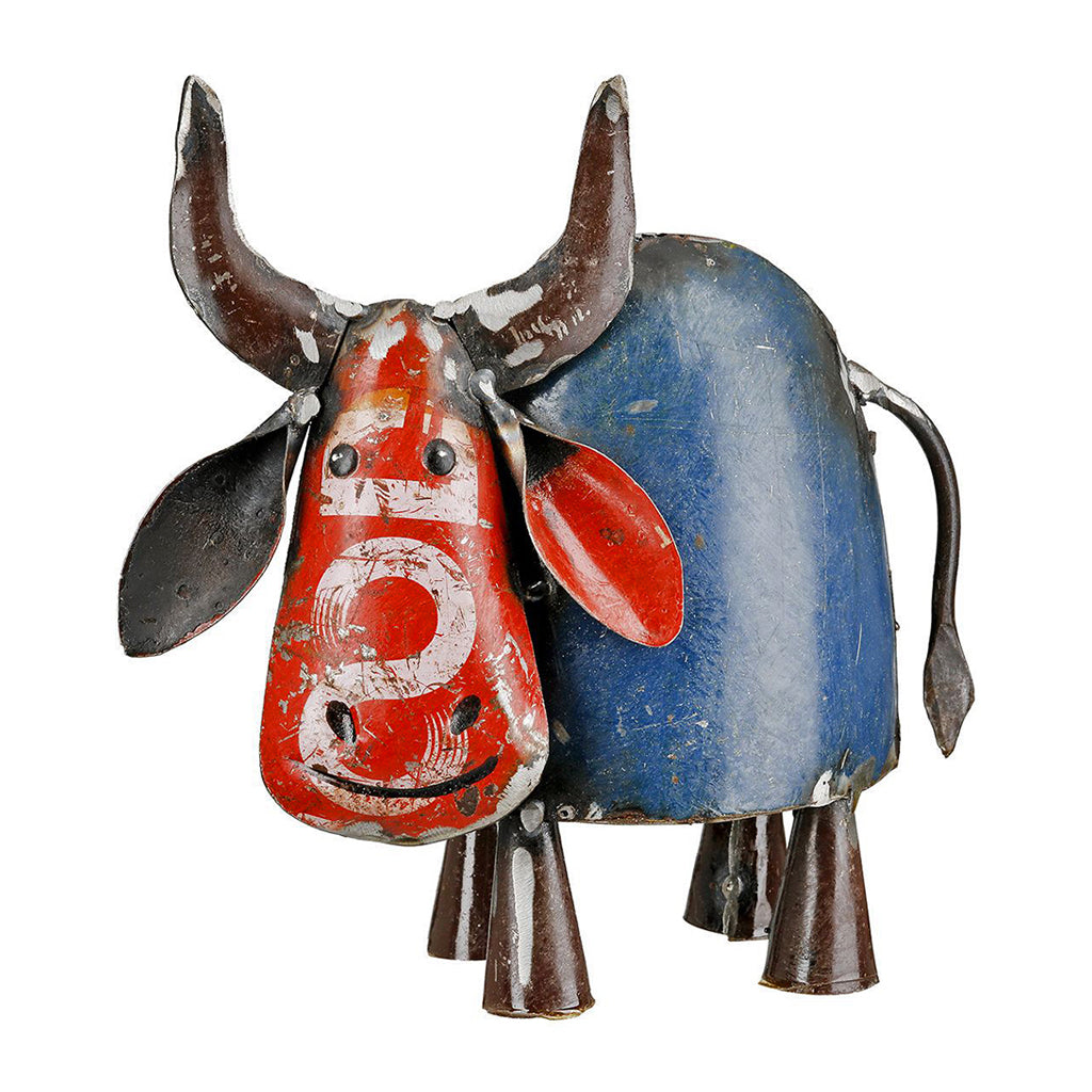 Tillverkad av återvunnen metall är varje exemplar helt unikt, med sköna spår av sitt tidigare liv i form av textrester, färgskiftningar och repor. Den rödblå kroppen och de stora hornen ger den en självklar närvaro, oavsett om du ställer den i hyllan, fönstret eller barnrummet. En riktig glädjespridare för dig som gillar lekfull och hållbar design!