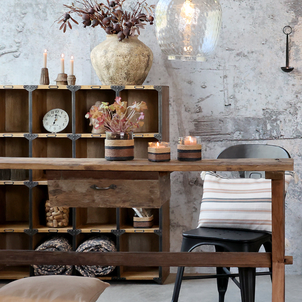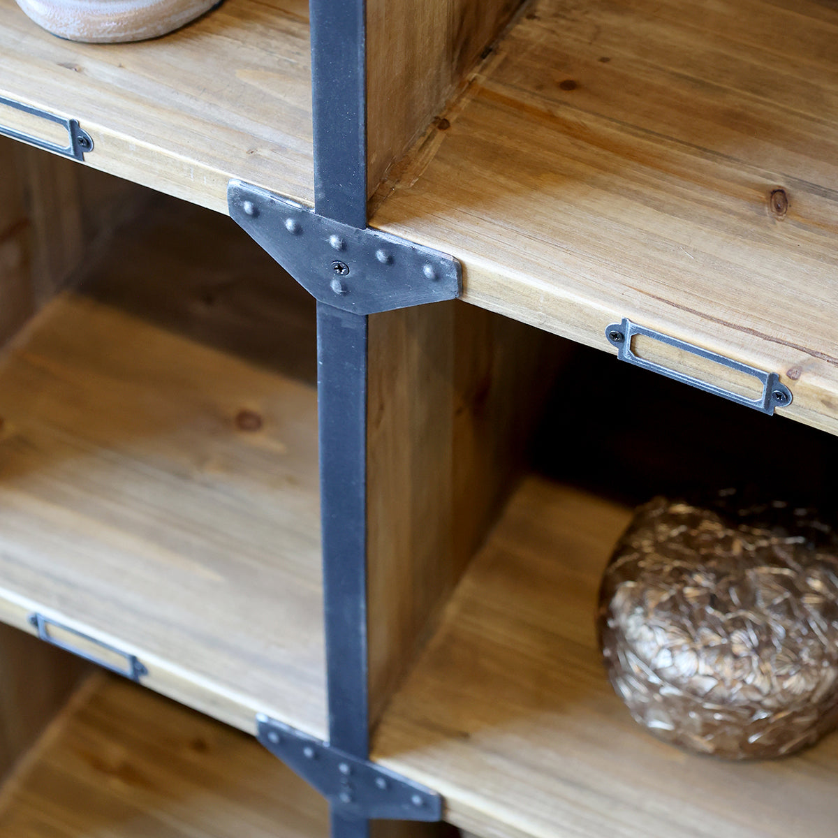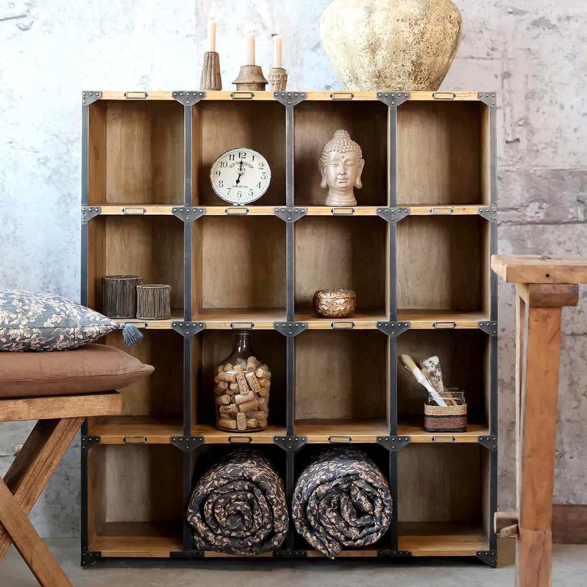 En robust trähylla med 16 rymliga fack, perfekt för dig som vill kombinera tuff och unik inredning med bra förvaring. Hyllan är byggd i trä med svarta metallbeslag som ger en rå, industriell känsla. Varje fack har lagom storlek för böcker, prydnader, korgar eller hoprullade textilier vilket gör det enkelt att skapa en snyggg ordning.