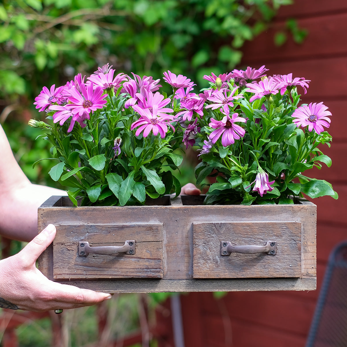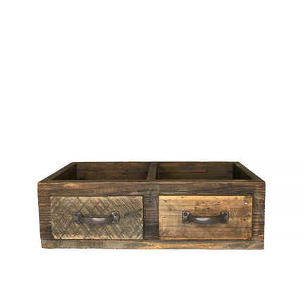 Rustik träkruka med två fack – perfekt för kryddväxter i köksfönstret, småredskap på skrivbordet eller förvaring i hallen. Tillverkad i återvunnet granträ med vackra variationer i både färg och struktur. Varje exemplar är unikt och bär spår av tidigare liv.