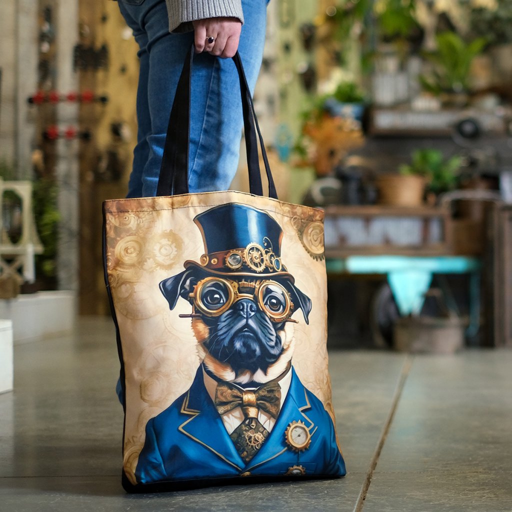 En tygväska för dig som vägrar smälta in i mängden. Den här steampunk-inspirerade herren med höghatt, monokel och mekaniska detaljer är redo att följa med dig ut i världen – oavsett om det gäller jobb, shopping eller en sväng på stan.