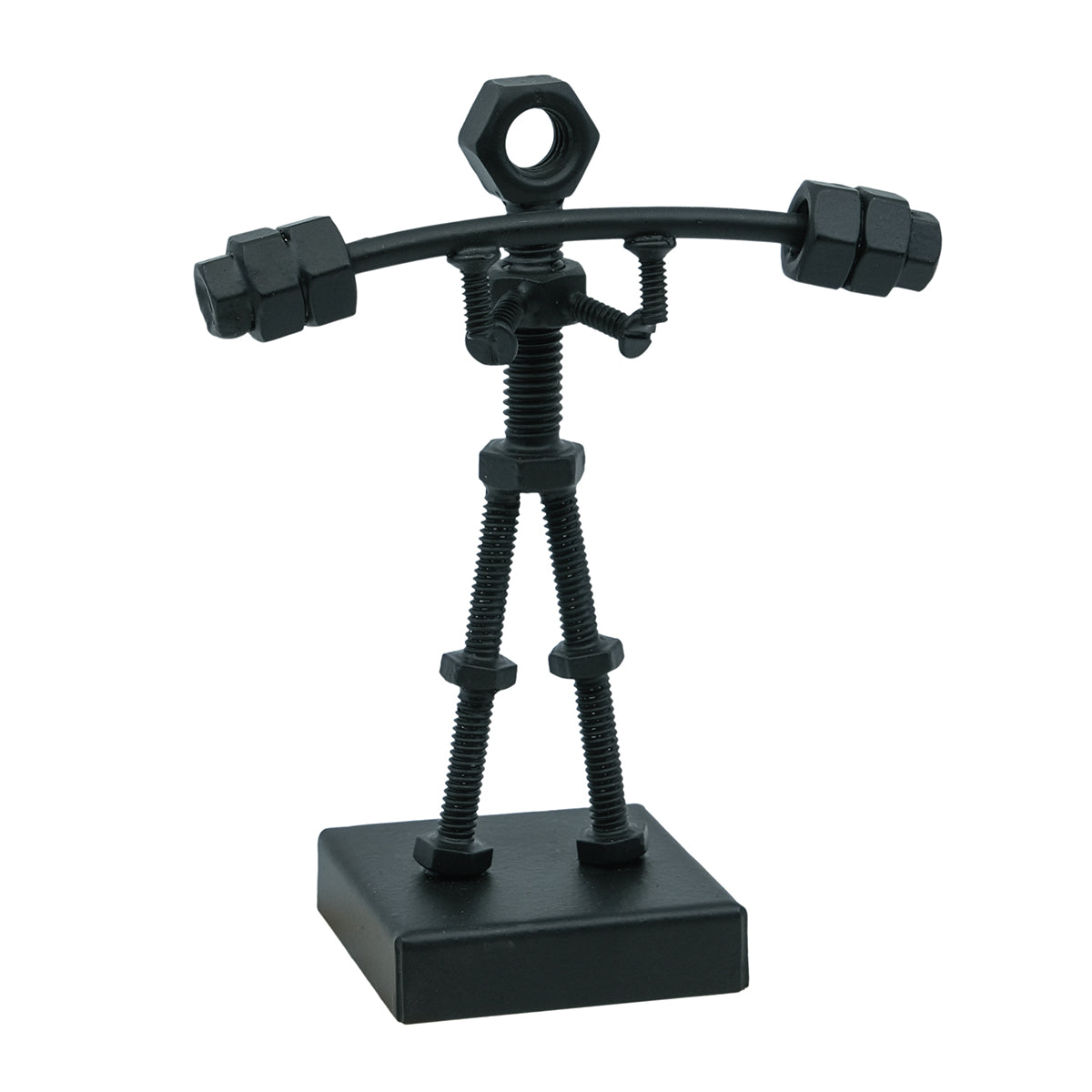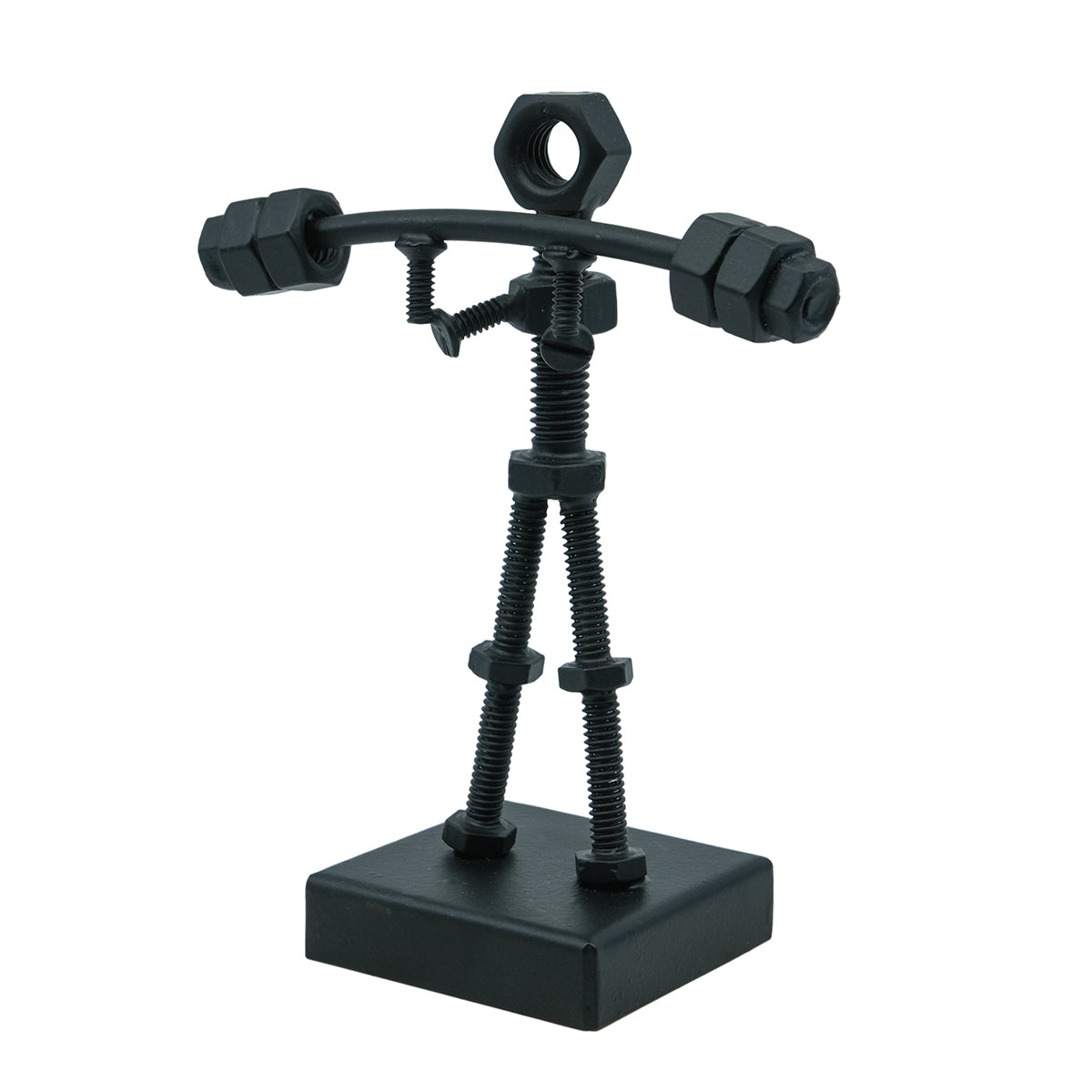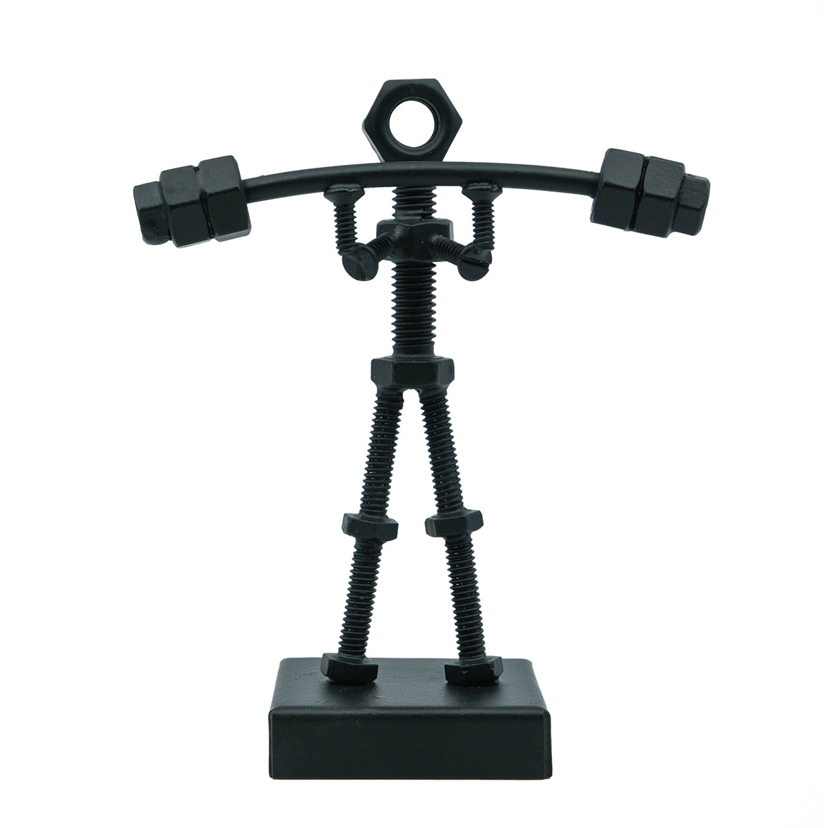Vår tuffa tyngdlyftare är tillverkad av återvunna gamla skruvar, bultar och annan metalljunk och har denna gång målats i svart färg.