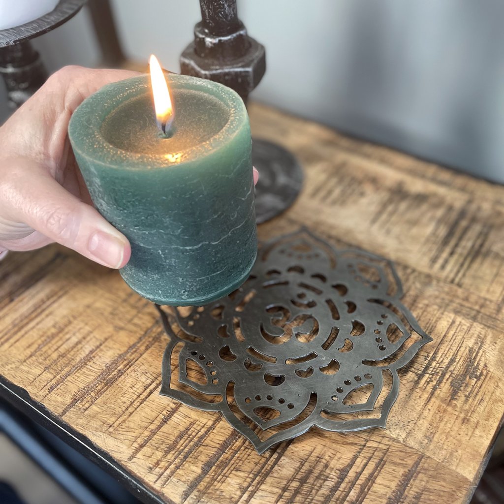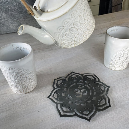 Metallunderlägg med utskuret mandala-mönster. Små fötter under.