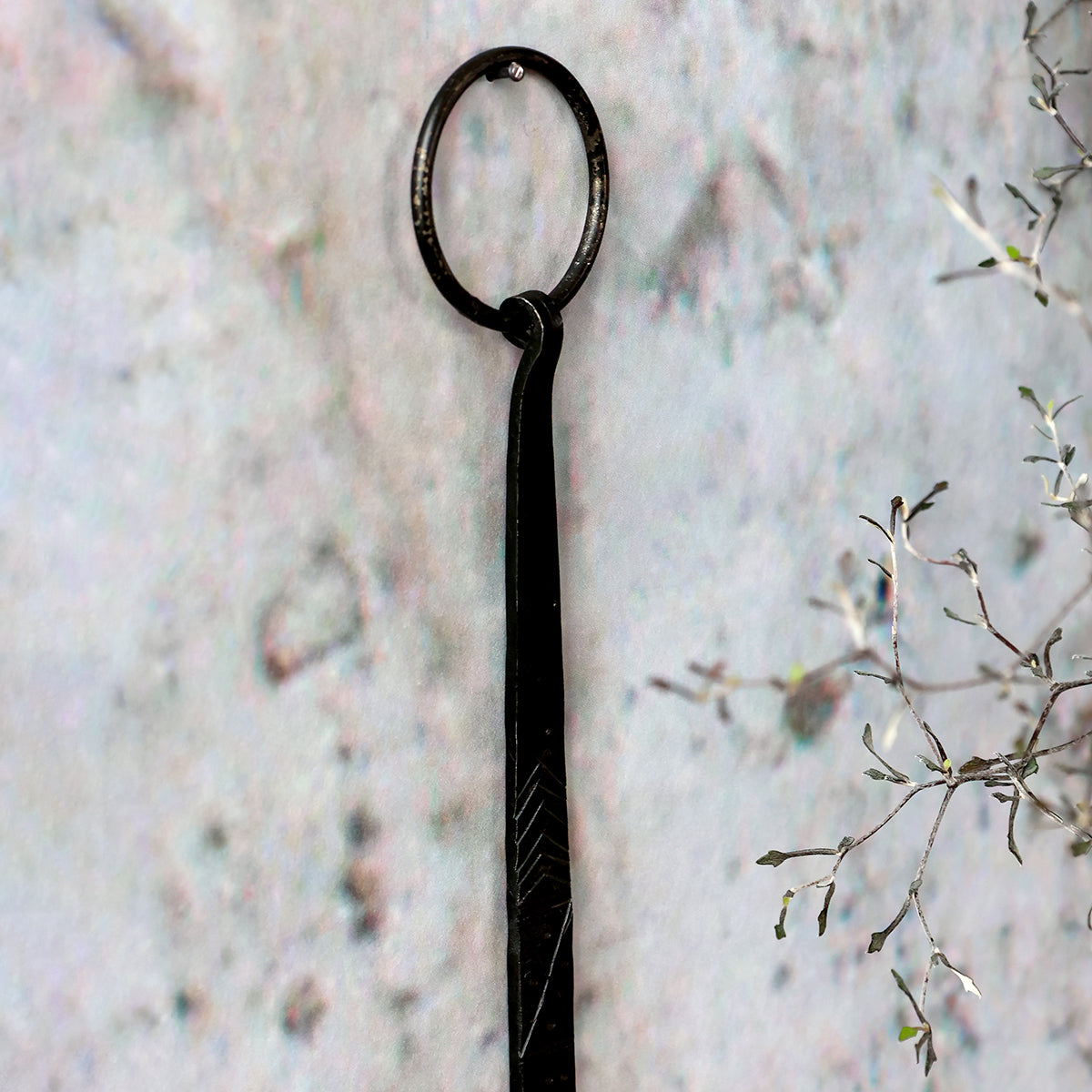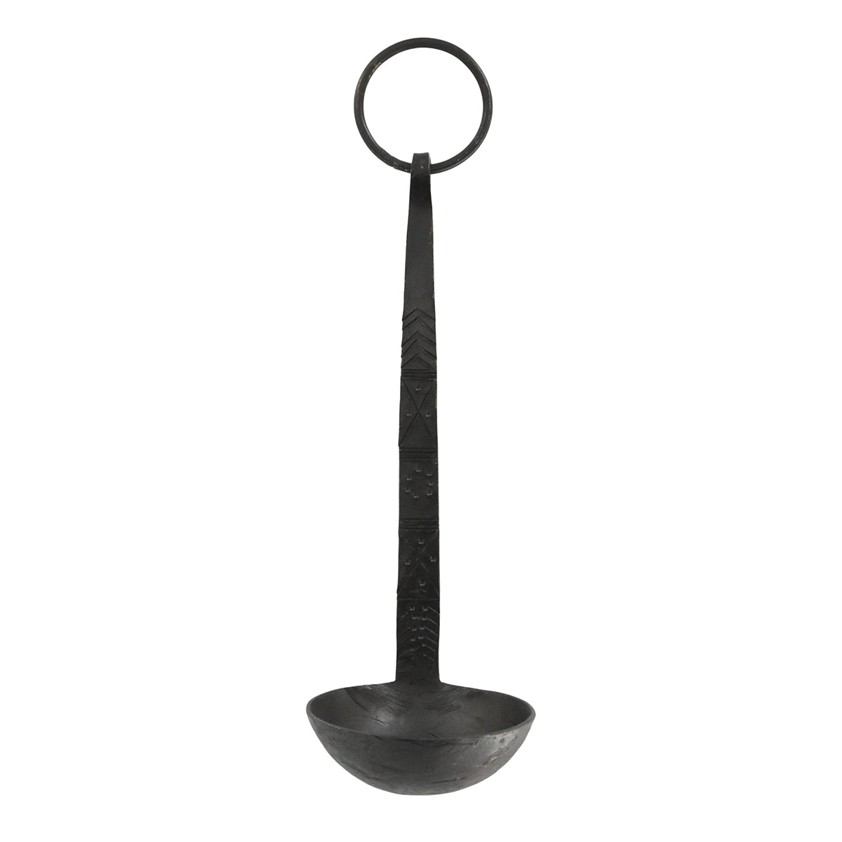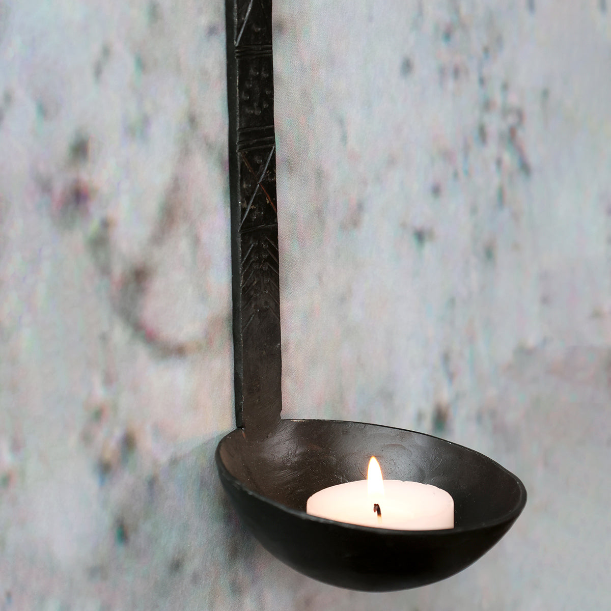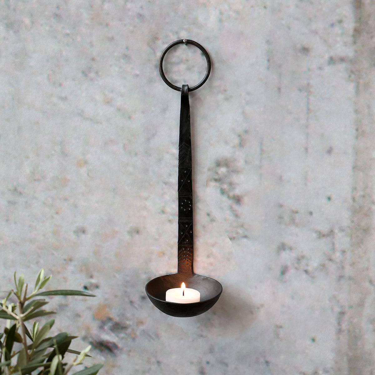 En stämningsfull ljushållare formad som en rustik slev i svart metall. Det dekorativa mönstret längs skaftet ger den ett extra fint uttryck, och den rundade skålen rymmer ett litet ljus som sprider ett mjukt och varmt sken.