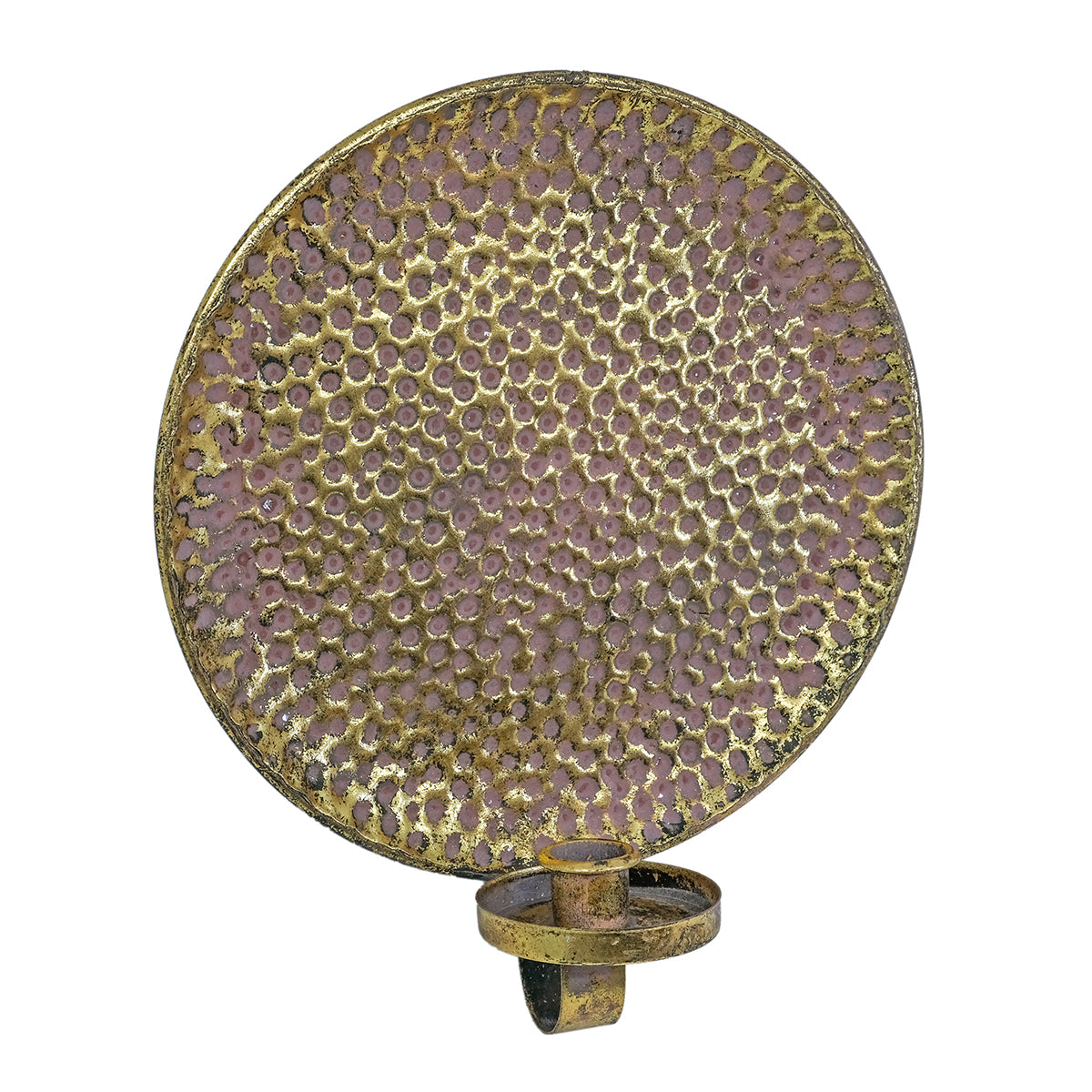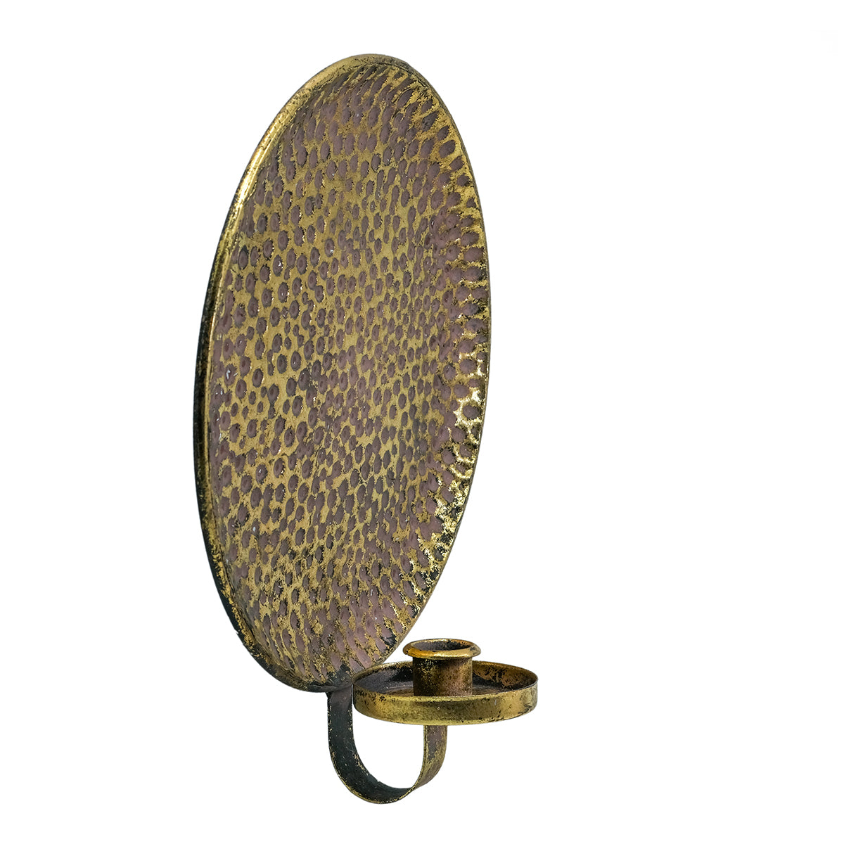Väggljusstake i guldfärgad, hamrad metall som sprider ett varmt och levande sken när ljuset tänds.