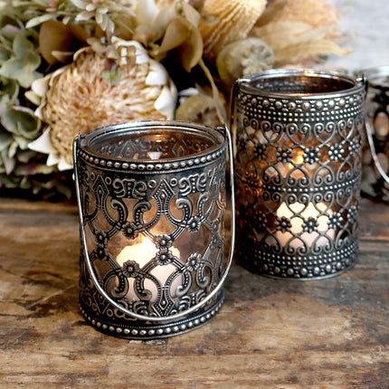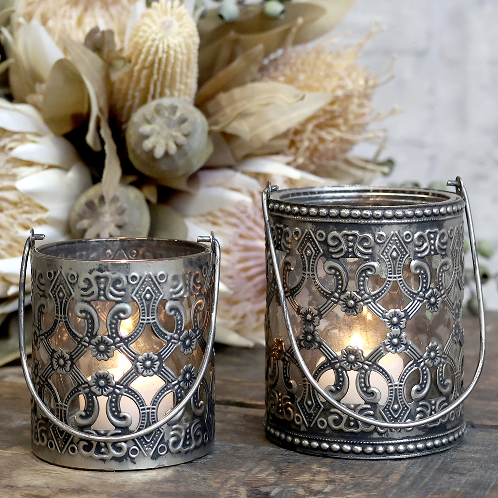 Jättefina värmeljuslyktor i glas och mönstrad metall.