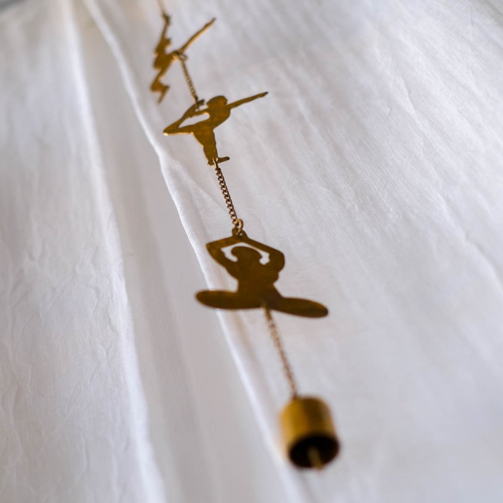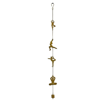 Supermysigt hänge med med ringklocka och yoga-positioner i guldmålad metall.